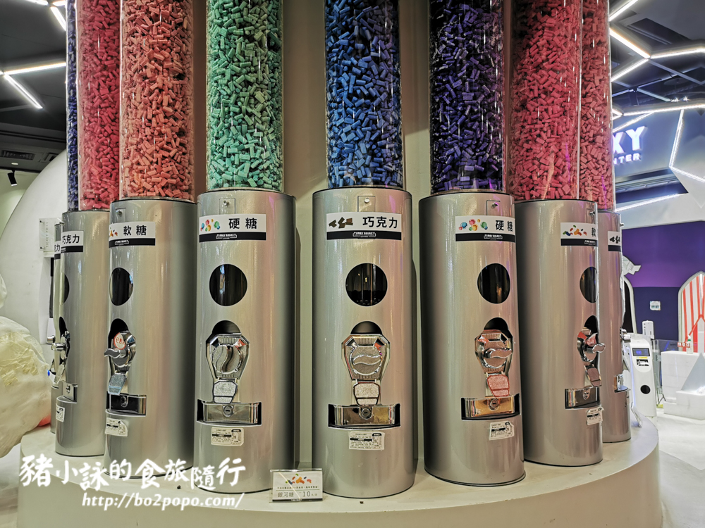 入口處的五顏六色繽紛的糖果機台很吸引小孩目光,