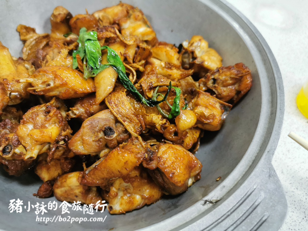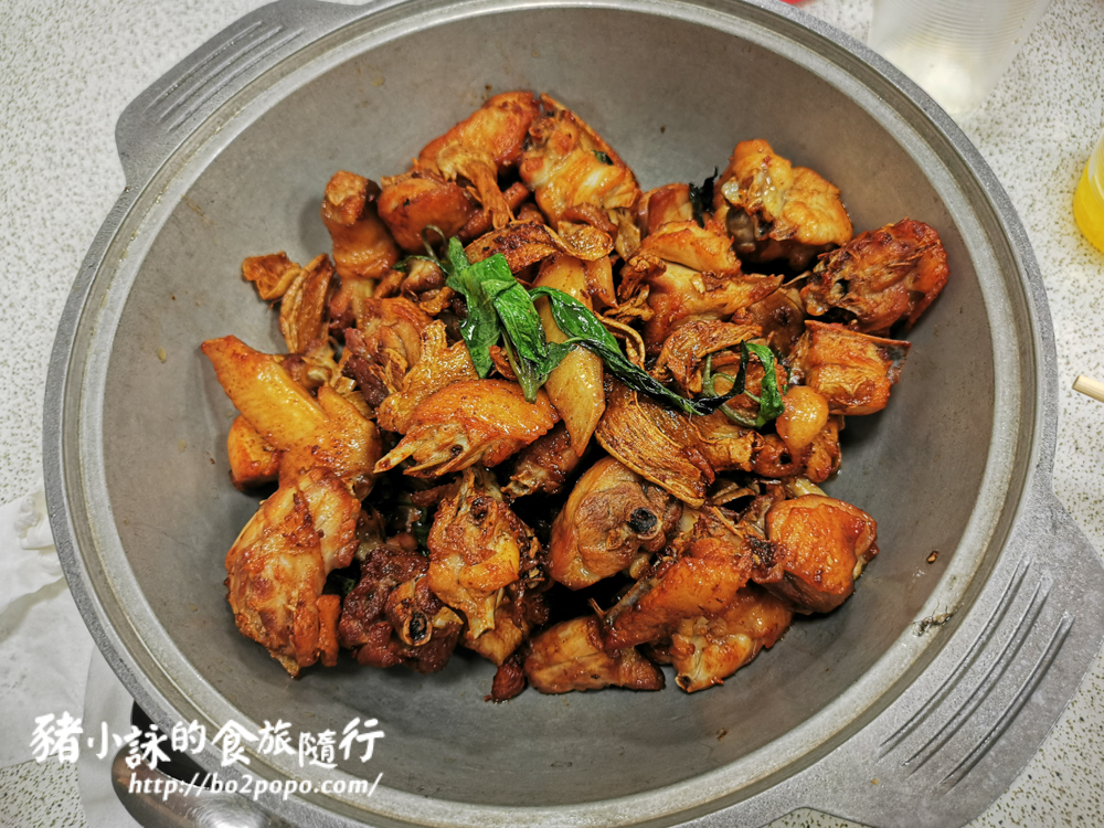 雞肉肉塊加薑片下去,用特製鐵鍋成裝上桌。