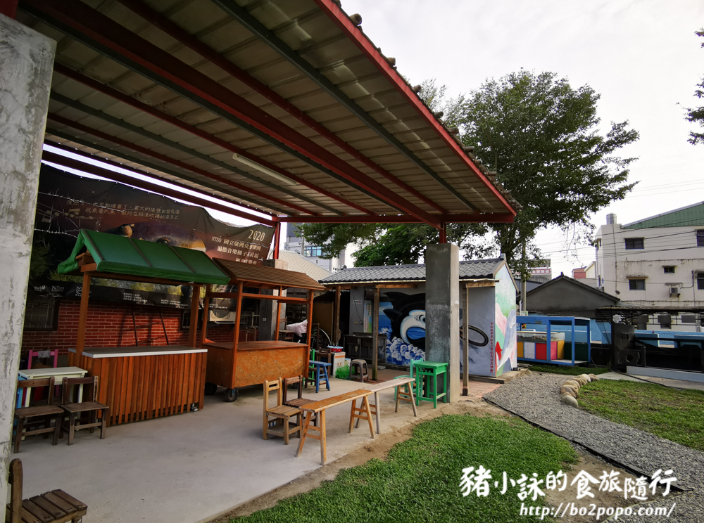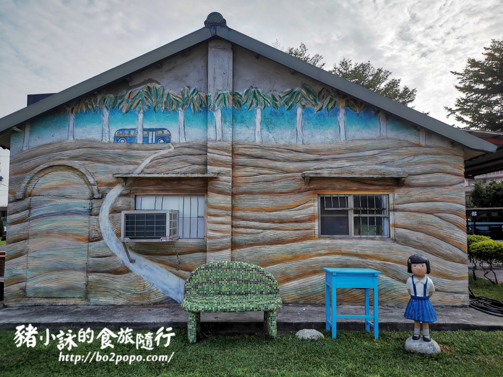 三合院的側邊是彩繪牆,搭配雕塑,十分可愛。