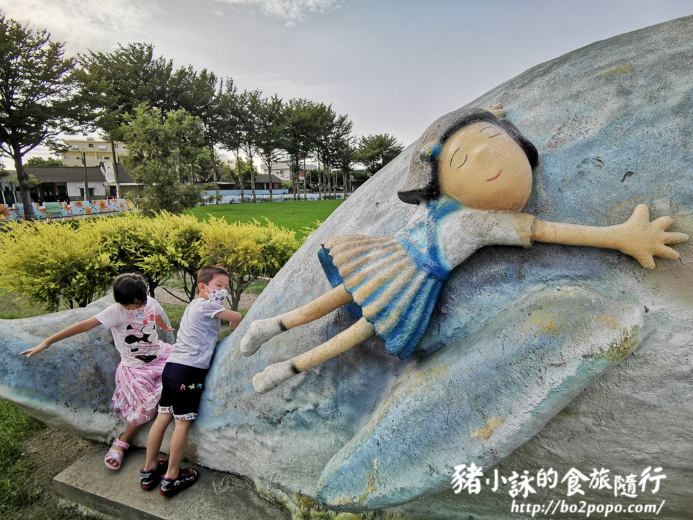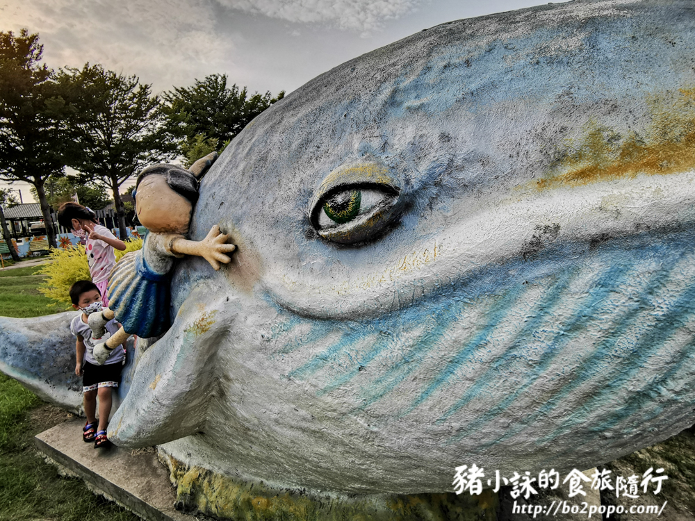 乘著鯨魚在海上飛翔的小女孩,這座鯨魚可說是公園的標的之一。