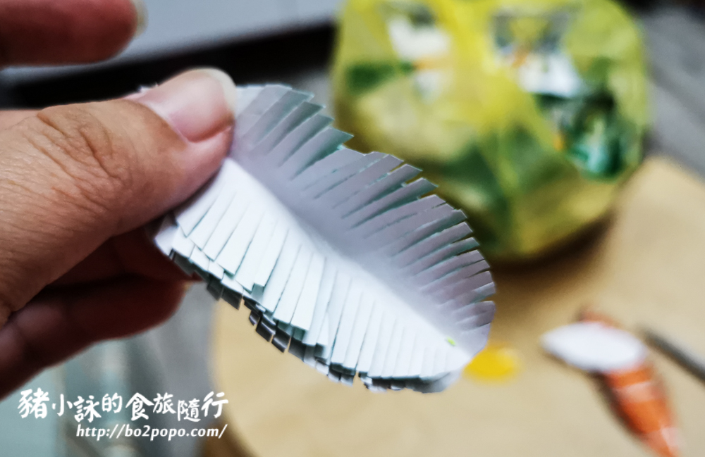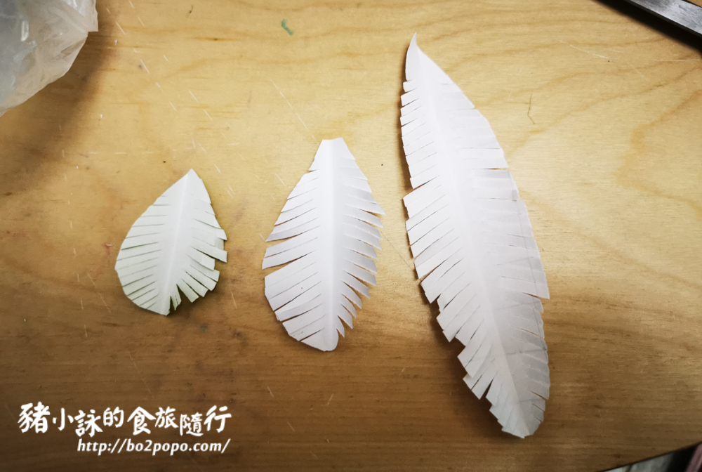 把包裝紙,剪成三種大小不同的羽毛,我是比較搞剛,連羽毛細邊都剪了,