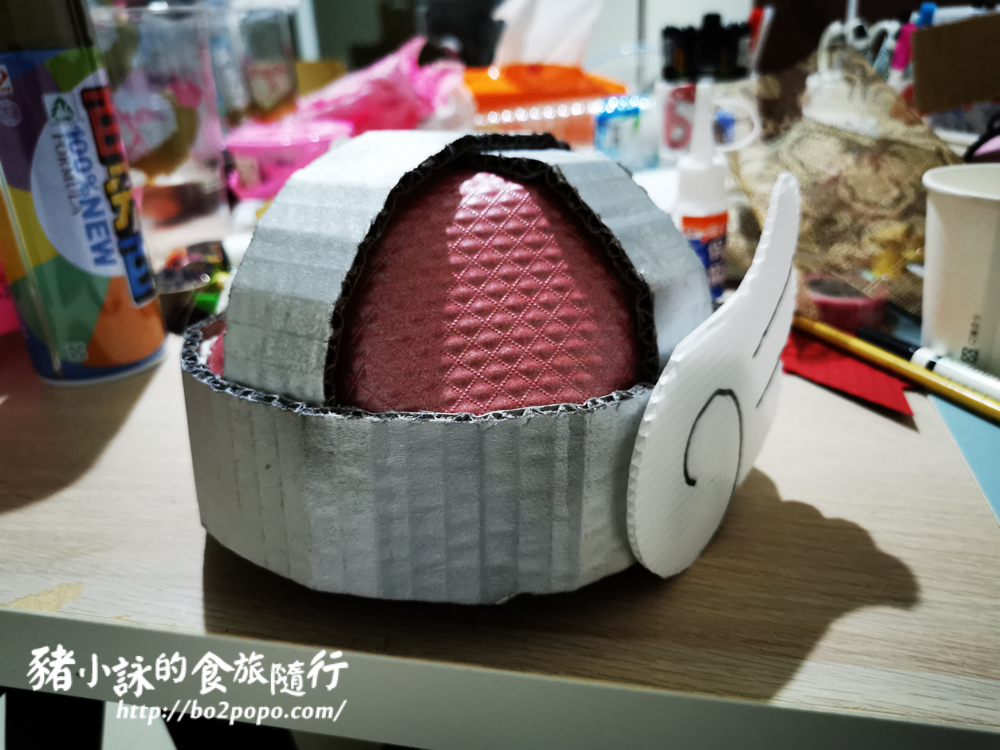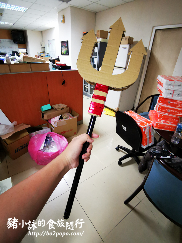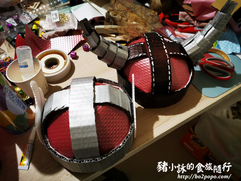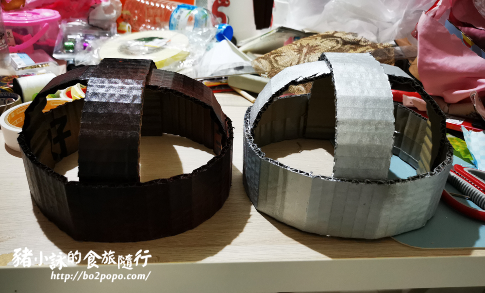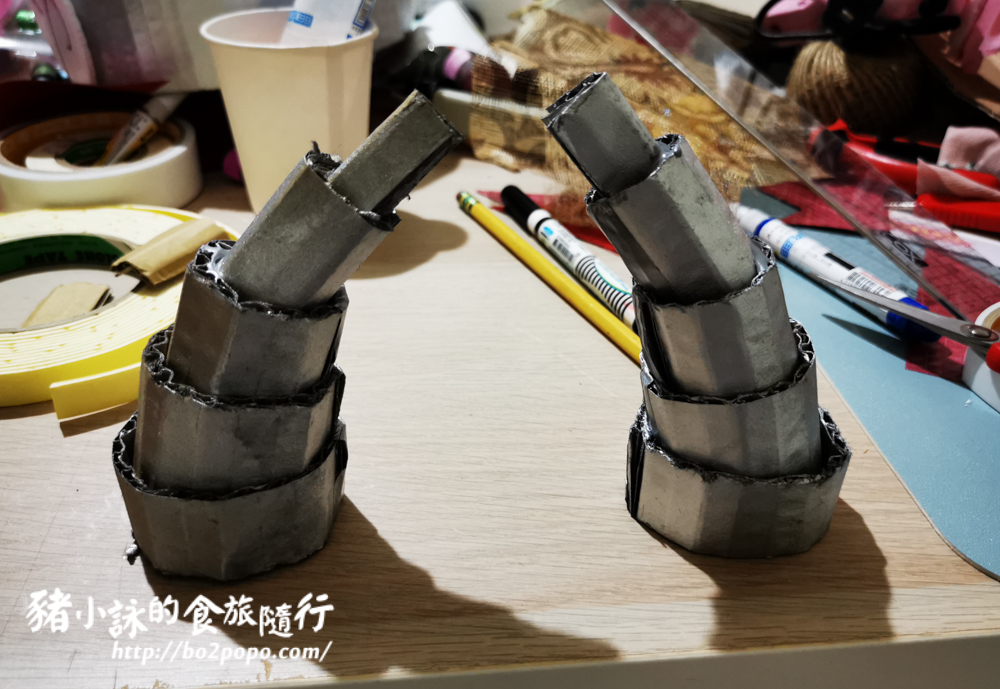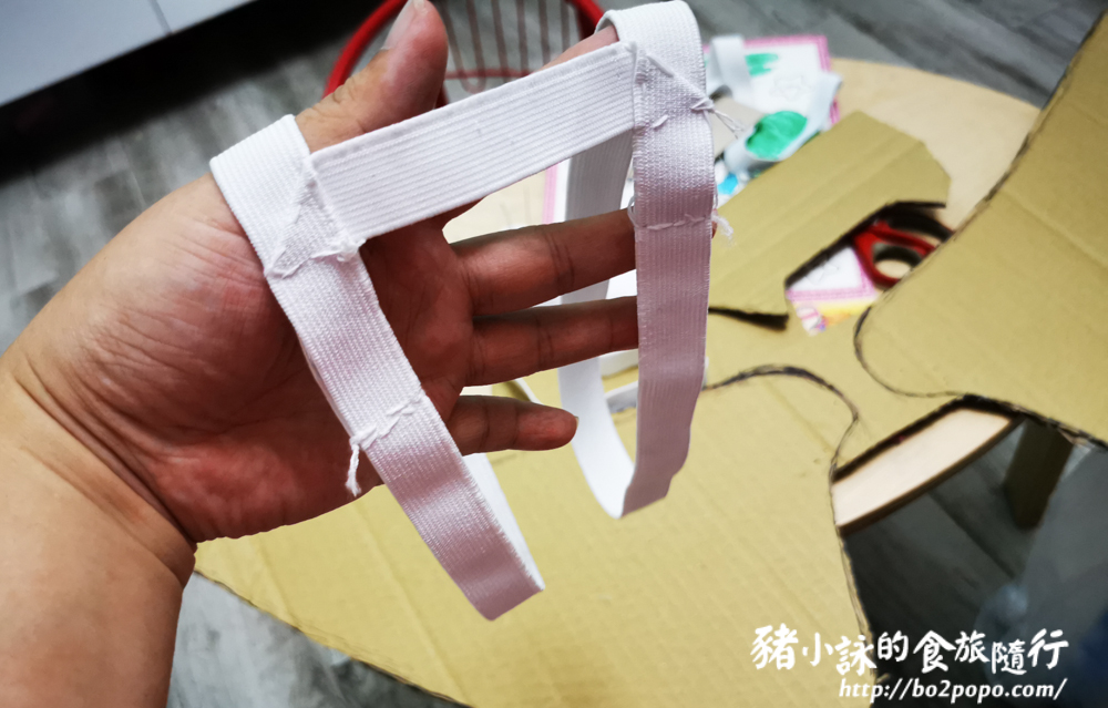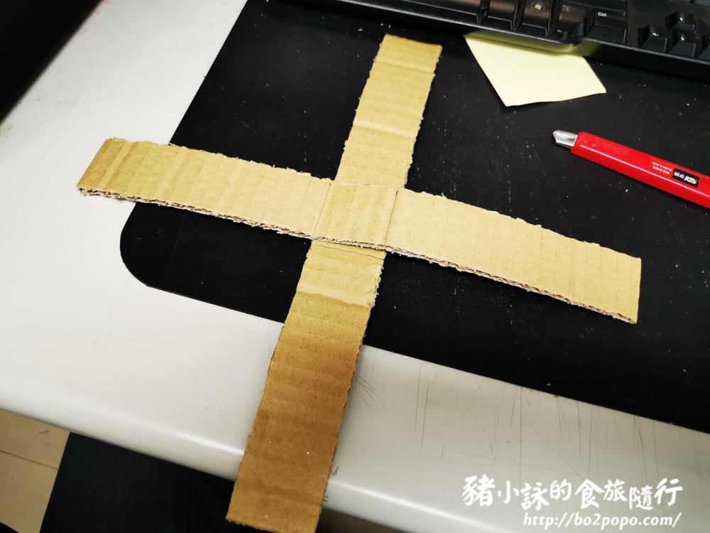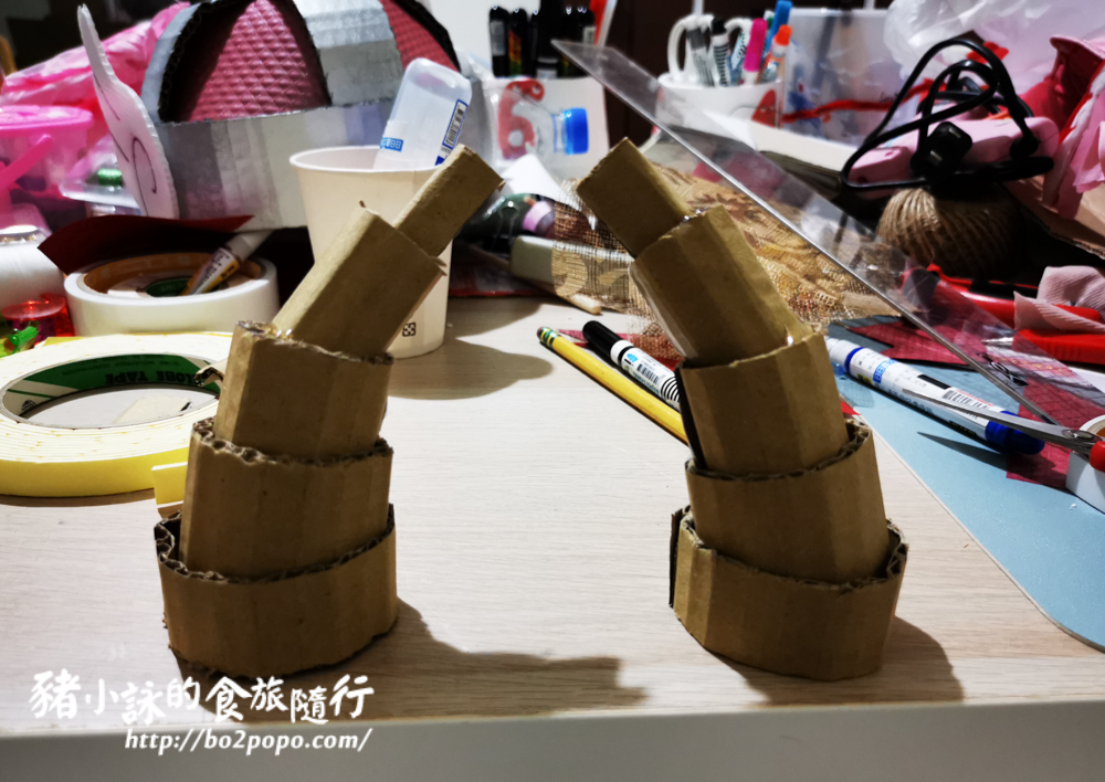 這部份很簡單,就是把瓦楞紙剪成叉子狀,固定在壞掉的玩具柄上方。