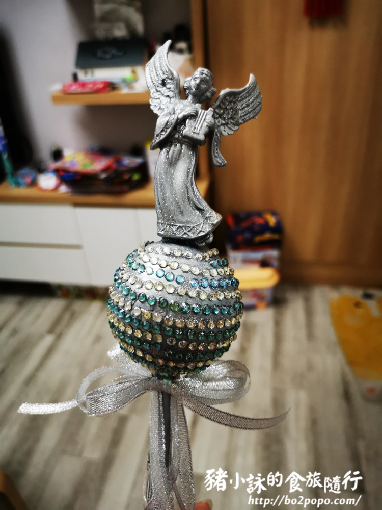 材料:插花的竿子/塑膠球/文具店買的小天使/緞帶/10元商品店買的水鑽/指甲油
