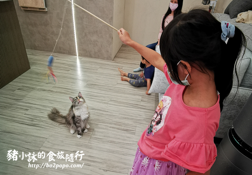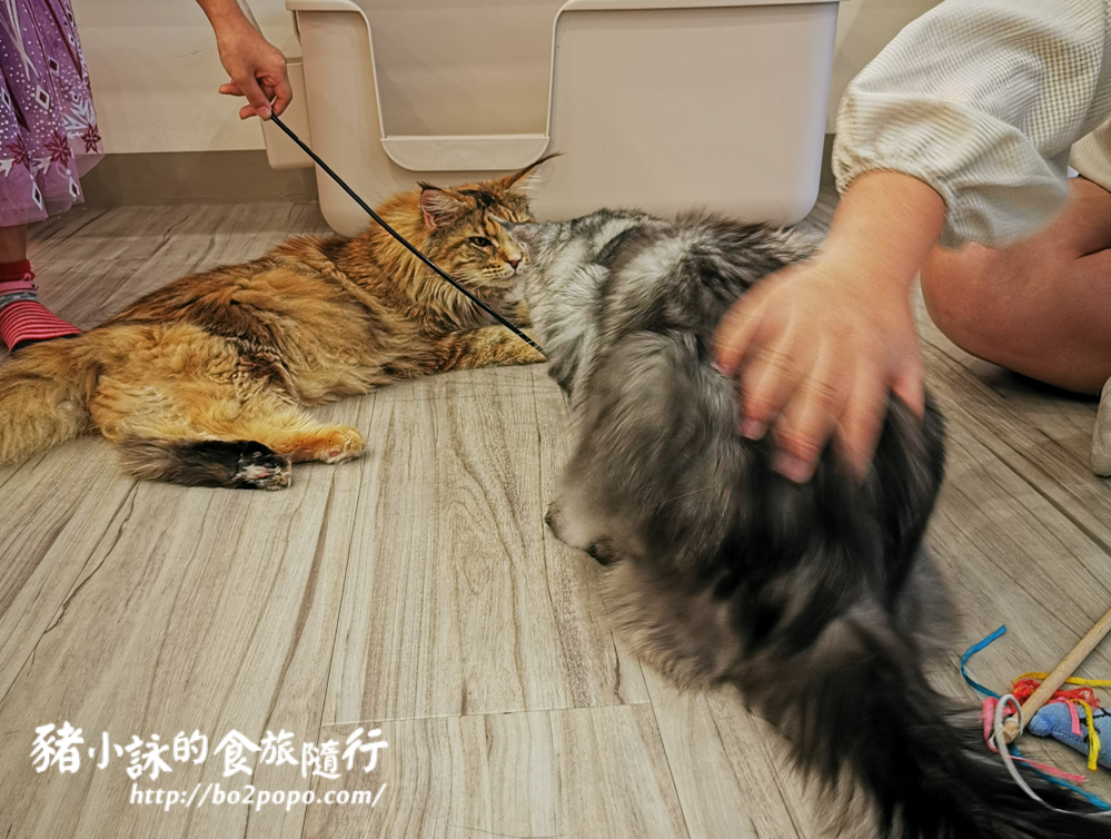 這邊有12隻貓咪,皆是緬因貓,貓咪們脾氣都很好,可以拿逗貓棒跟他們互動。