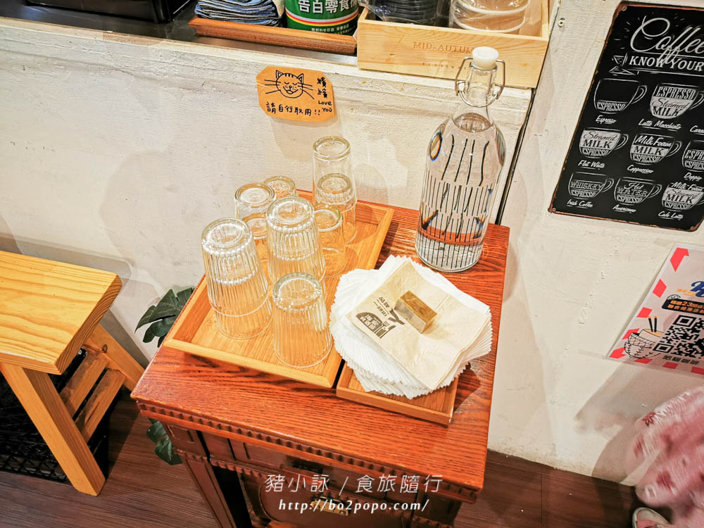 採半自助方式,畫單後先至櫃台結帳,餐具跟餐點會由店員送上桌,而茶水在櫃檯前需自取。