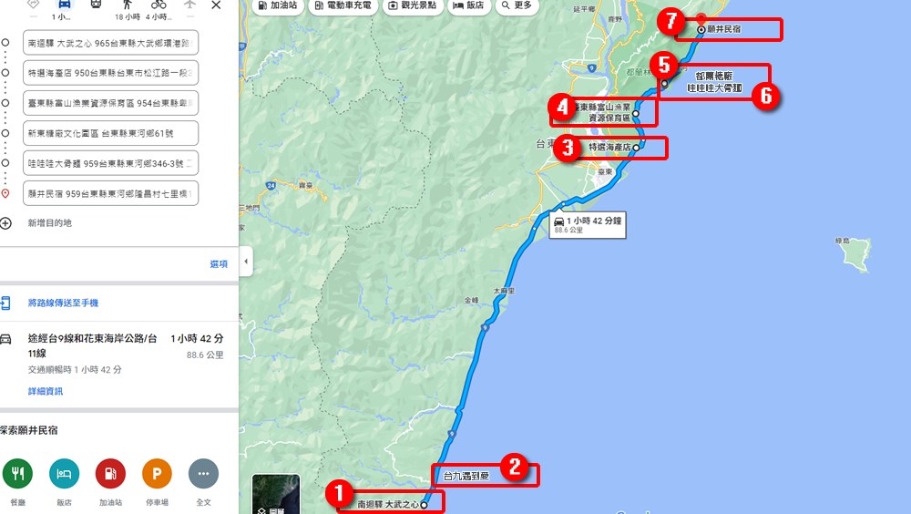 台東市春享color民宿->成功都歷部落傳統海域->東河金樽遊憩區->東河馬利諾廚房->