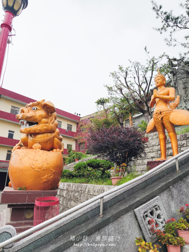 樓梯兩側下方是金色石獅,中間兩側則是泰國神像,也算是很多重元素了。