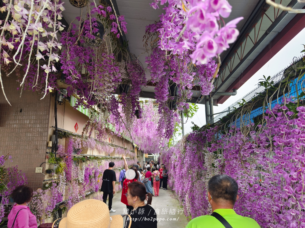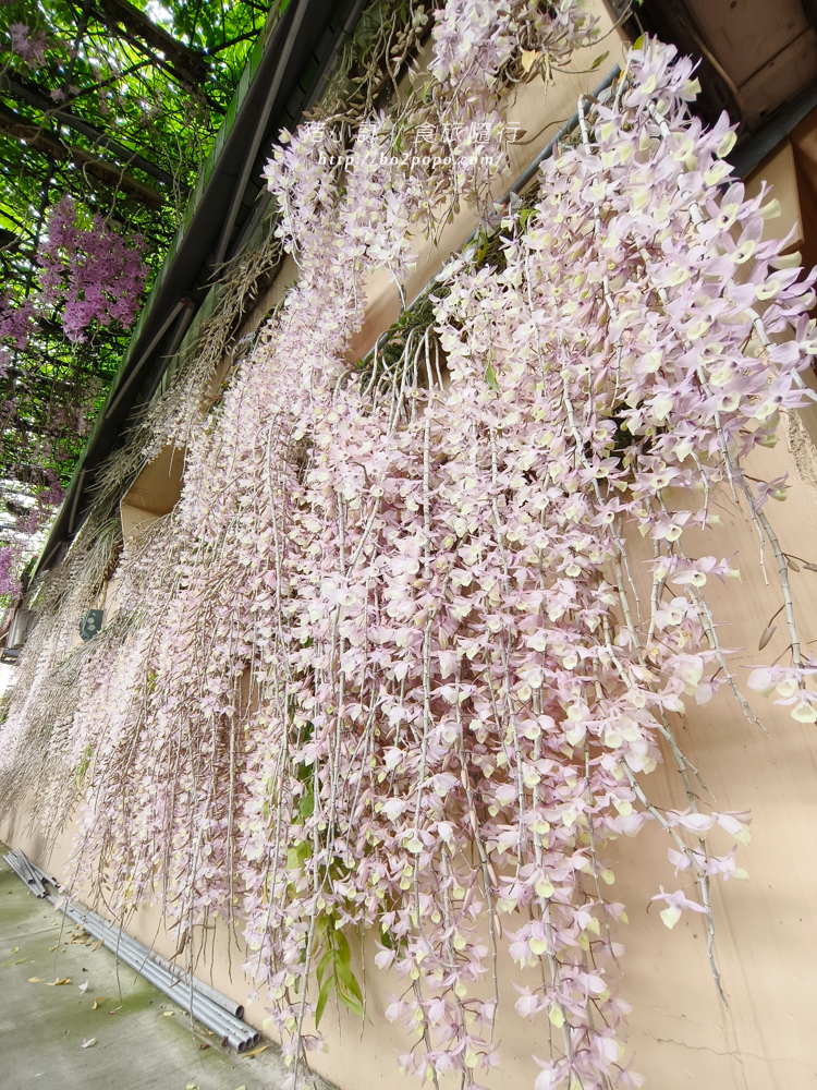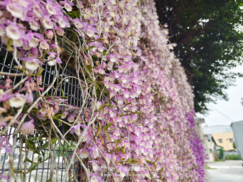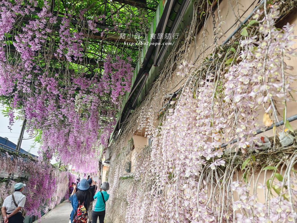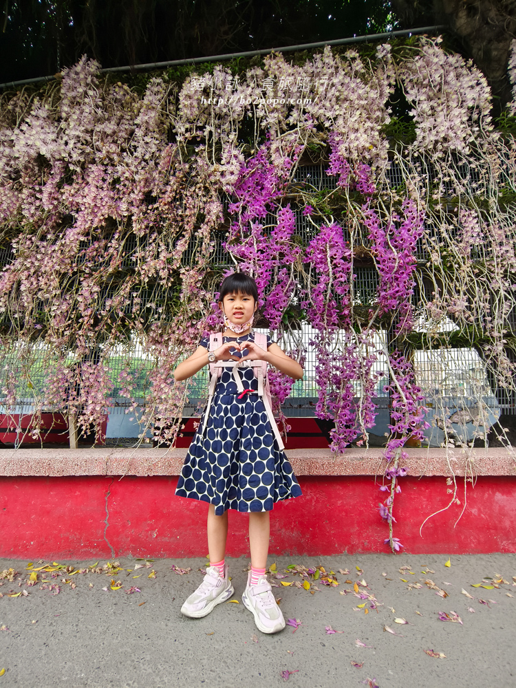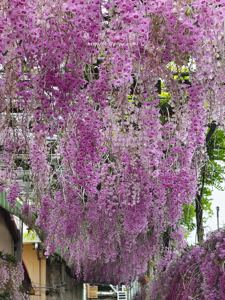 忠雲宮旁有條充滿粉紫跟粉紅色相間的瀑布蘭隧道,可說是重點特色之一。