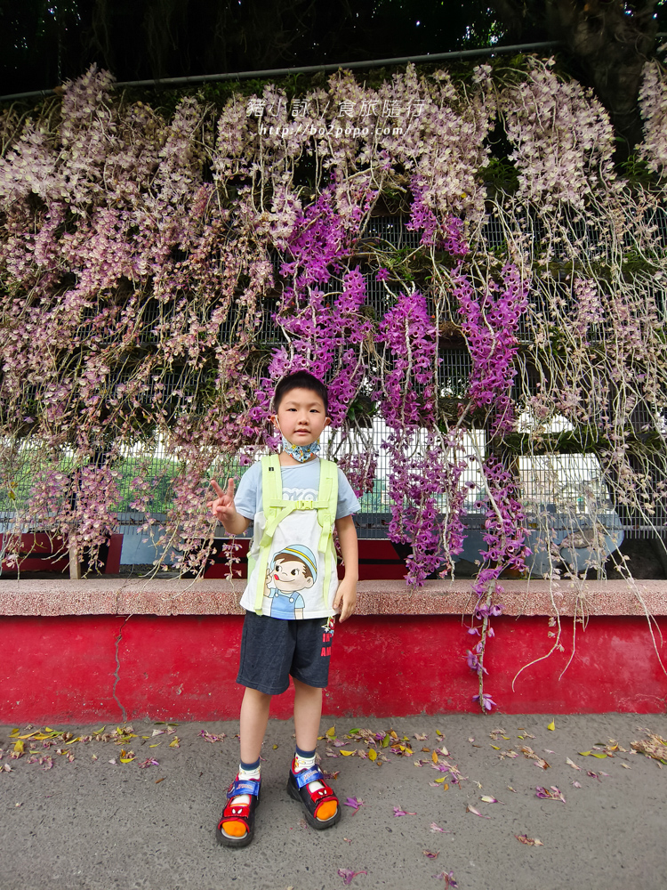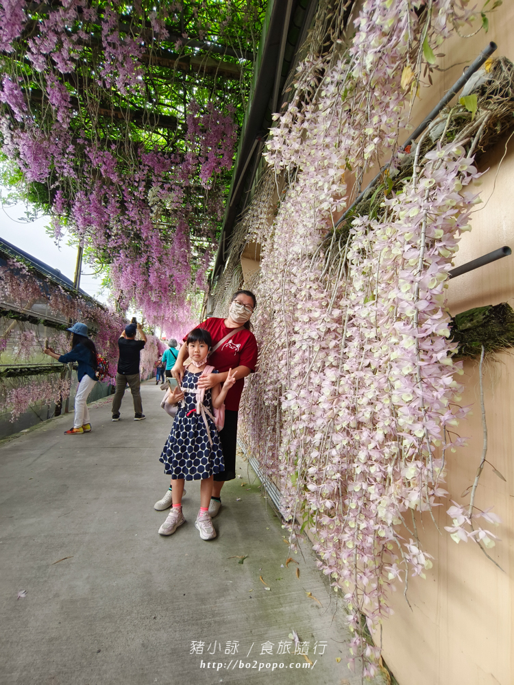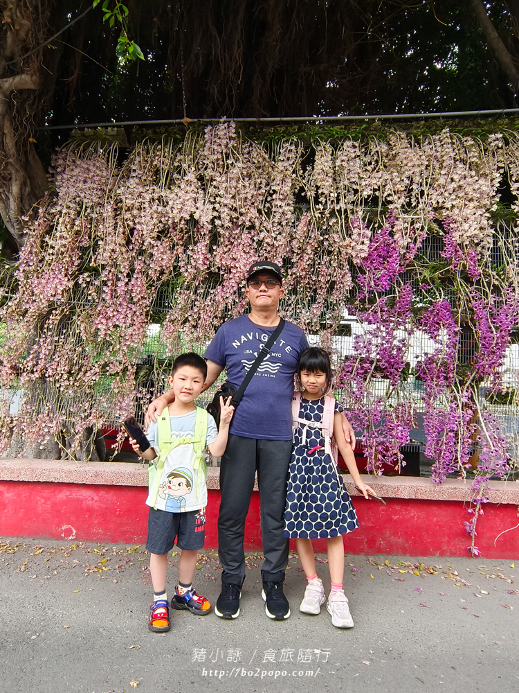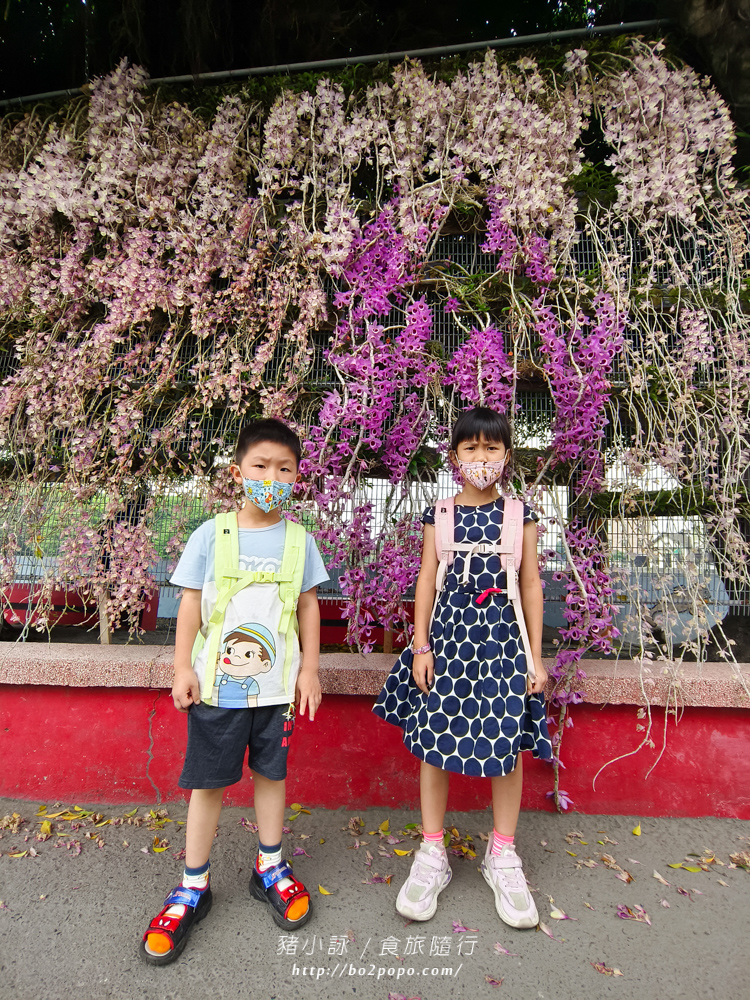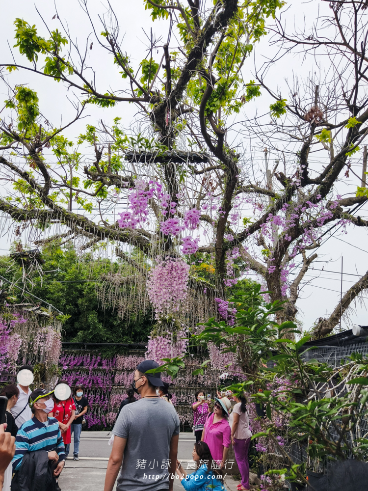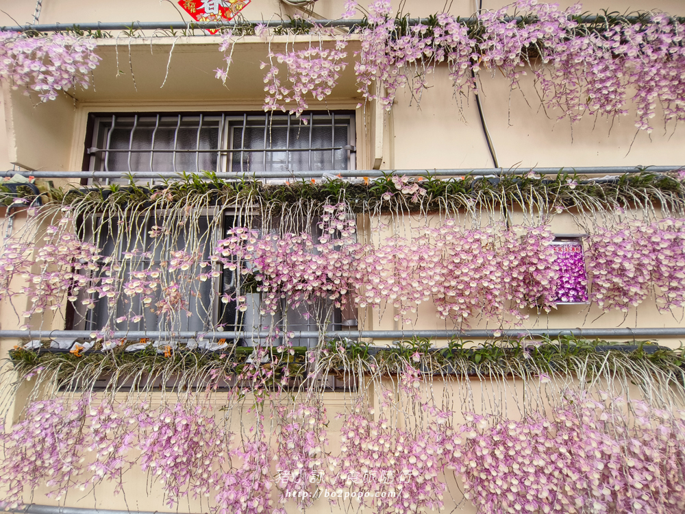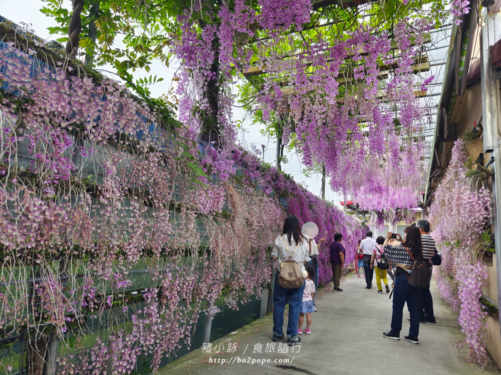 忠雲宮旁有條充滿粉紫跟粉紅色相間的瀑布蘭隧道,可說是重點特色之一。