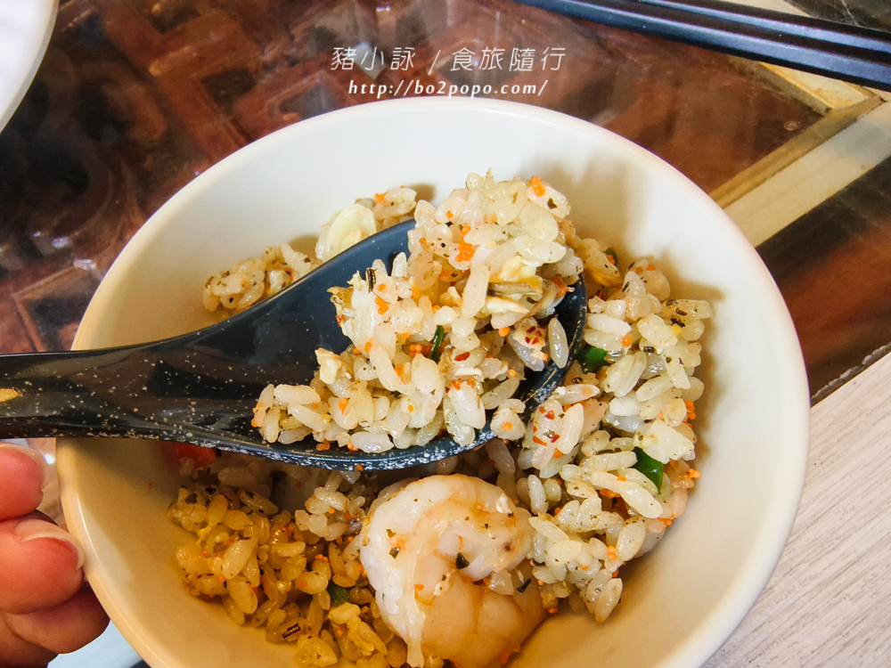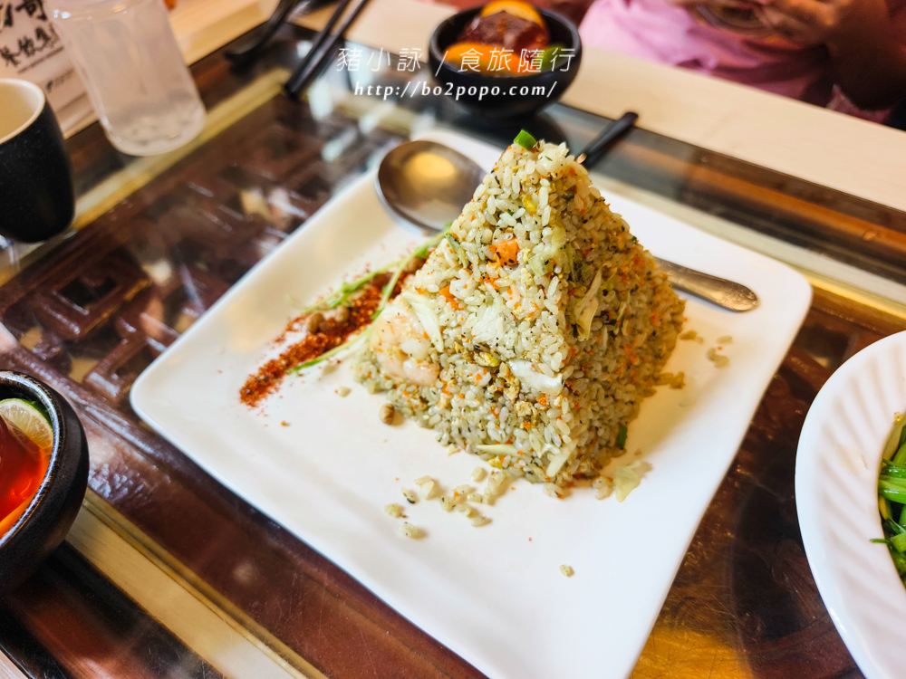 炒飯約莫兩到三人的份量,米飯被堆疊成一座完美的金字塔狀,點綴著碧綠的茶葉粉末,綠綠的宛如一座迷你茶山。入口後,首先感受到的是米飯的Q彈與蛋香的溫潤,隨後,一股清新而不搶戲的茶韻緩緩釋放,與炒飯的鹹香完美融合。
