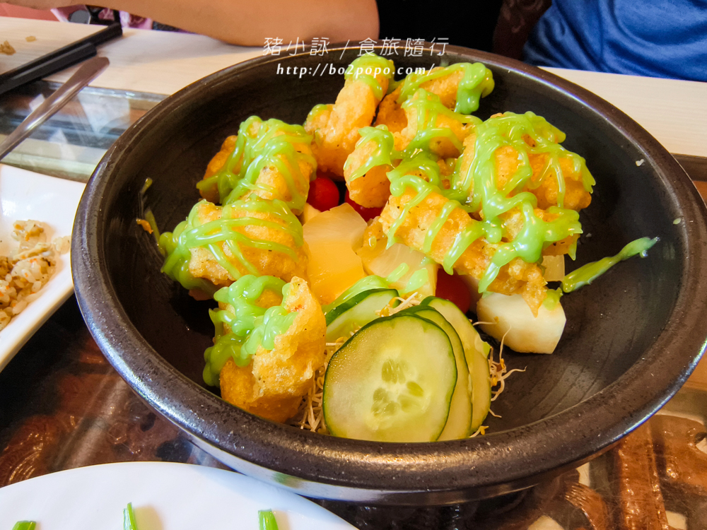飽滿的蝦球裹上金黃的炸衣,搭配著紅綠相間的彩椒與鳳梨塊,淋上特製醬汁。蝦球外酥內彈,每一口都能感受到蝦肉的鮮甜與彈性。搭配多種水果,使得這道菜在傳統的鳳梨蝦球基礎上,增添了一份獨特的層次感與清爽度。