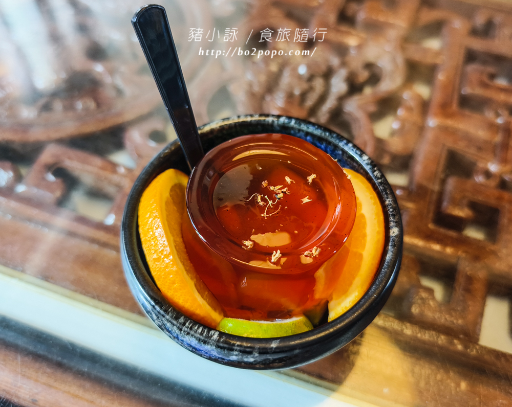 晶瑩剔透的茶凍盛裝在小巧的器皿中,表面點綴著數朵金黃的桂花,散發著清雅的香氣。茶凍的質地Q彈滑嫩,帶著淡淡的茶香與桂花的馥郁。甜度控制得宜,沒有一般甜點的甜膩感,反而更顯得清爽。
