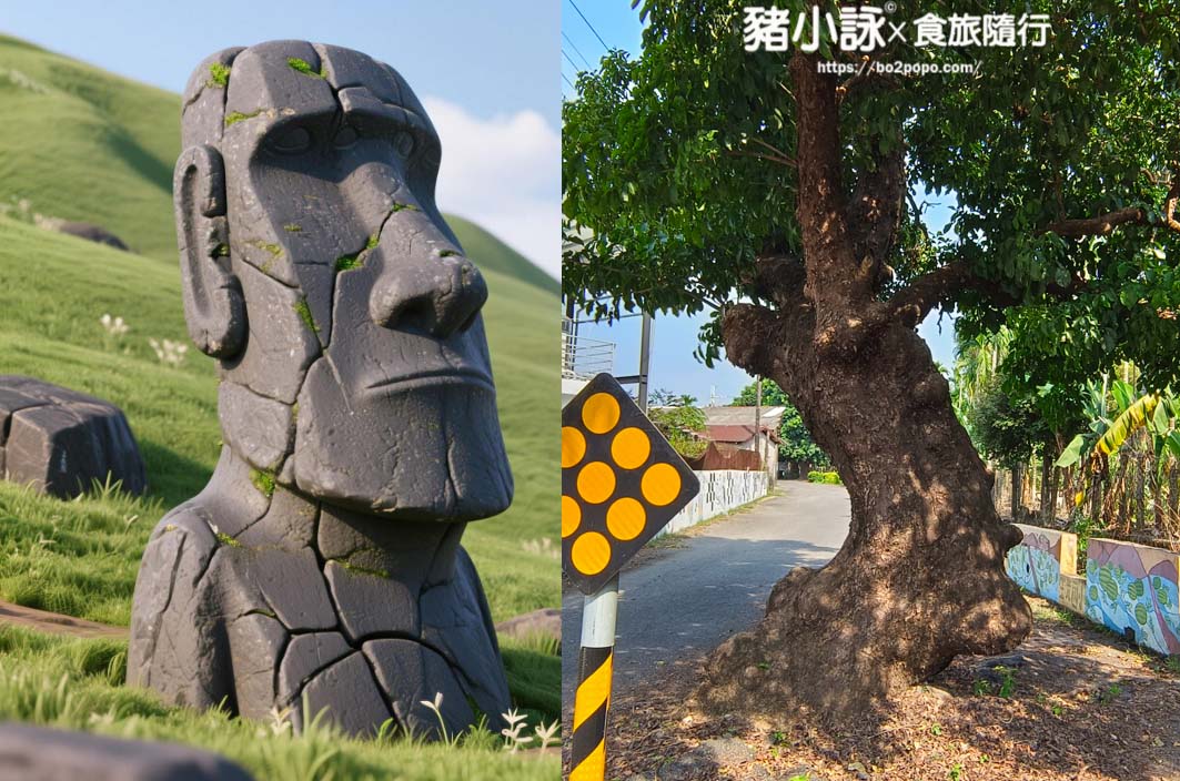 這棵摩艾樹位於佳冬石光見庄內的道路中央,是一棵樹齡上百年的老茄苳樹。之所以爆紅,是因為從特定角度觀看,巨大的樹幹側面輪廓神似復活節島的摩艾石像,成為另類的網紅景點。