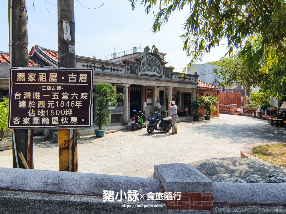 ▼主業是經營釀酒、染布致富的蕭宅,始建於清朝咸豐年間,經過三代擴建才達到目前的規模-五落四院的雙「回」字型客家圍龍屋。屋內高度由前至後逐進升高,意即「步步高升」。