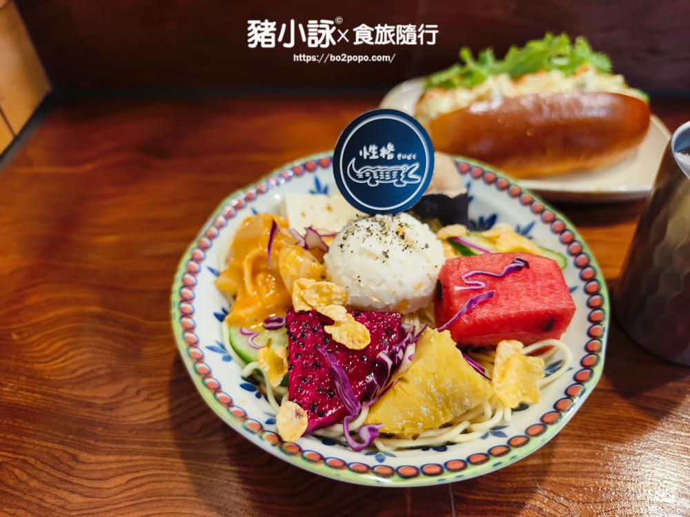 新鮮蔬果沙拉麵-光是擺盤,在視覺上令人耳目一新。碗中盛滿了色彩繽紛的當季新鮮蔬果,像是火龍果、西瓜、菱角、小黃瓜等等,搭配Q彈的麵條,淋上特製的和風芥末醬汁。芥末的辛香被和風醬的甘甜所中和,呈現出一種溫潤卻又帶有提振作用的風味。每一口都能品嚐到蔬果的清脆、麵條的滑順,以及醬汁的酸甜微辛,多層次的口感與味道在口中交織。