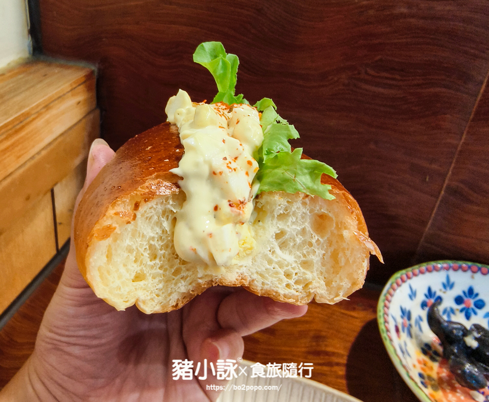 日式雞蛋沙拉餐包-橢圓外觀的餐包,外層微微烤過的香氣與內裡柔軟的麵包體完美結合,而那滑順細緻的蛋沙拉,口感細膩、不過鹹的調味,是很清爽的味道。