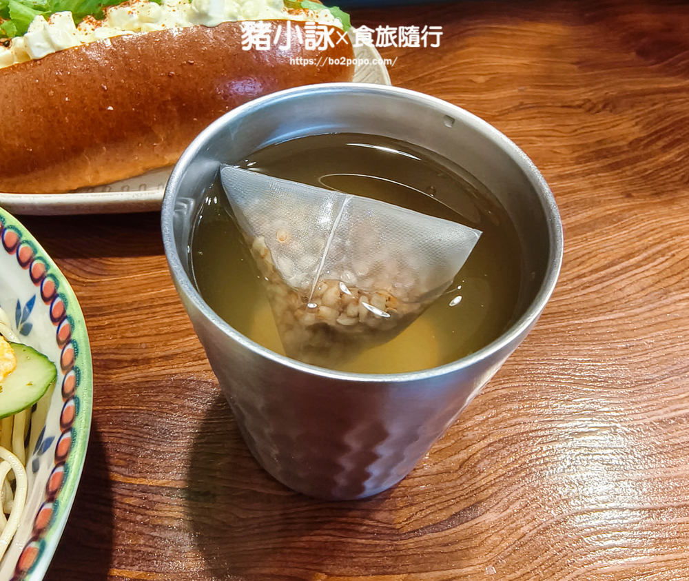 冷泡蕎麥-套餐中的飲品是冷泡蕎麥茶跟冰檸檬綠二擇一,如果要換購其他飲品,可折抵30元,當天我選的是冷泡蕎麥茶。在品嚐過餐包的香甜與沙拉麵的豐富後,一杯清雅的冷泡蕎麥茶恰好能扮演解膩與平衡的角色。蕎麥茶特有的香氣,在冷泡的萃取方式下,更顯得清澈而純粹。