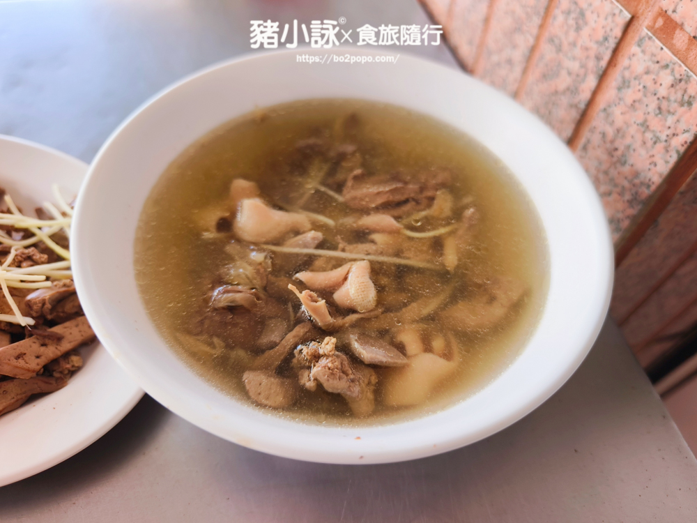 一碗綜合內臟湯用料實在,包含心、肝、胗、腸等多種鴨內臟,湯頭清甜不濁,帶著淡淡的薑絲香氣,能平衡主食的濃郁感。內臟處理得非常乾淨,吃起來毫無腥味,口感彈牙。