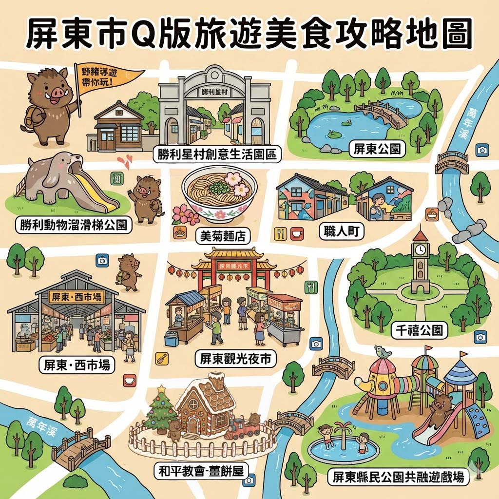 透過精心規劃,將這些甜蜜的小屋組成一座充滿歐式氛圍的迷你城市。這座城市最大的亮點,在於巧妙地融入了多個屏東在地指標性建築與特色地景,例如勝利星村、鵝鑾鼻燈塔、縣民公園等等,讓參觀者在欣賞夢幻薑餅屋的同時,也能看見熟悉的屏東風貌,洋溢著獨特的在地情感與無限創意。