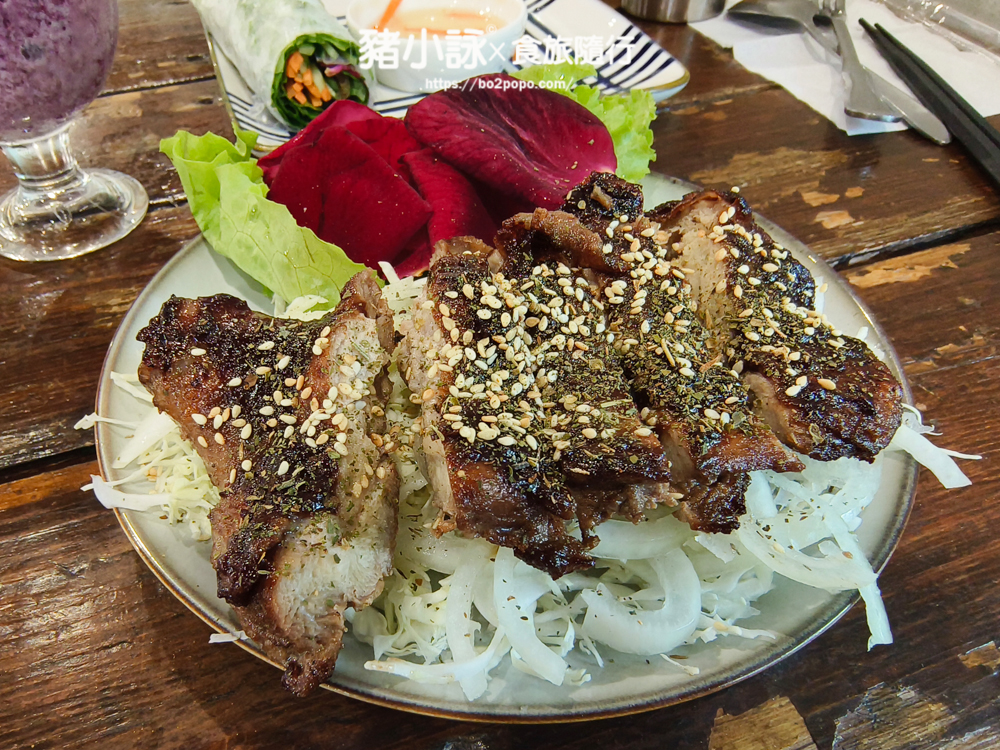 玫瑰醬烤雞腿是農場的招牌菜之一,雞腿肉質鮮嫩,搭配自製的玫瑰醬,甜中帶酸,讓人食指大動。每一口都能感受到香氣與味道的完美融合。不過這不含主食,如果怕吃不飽可以加點白飯。