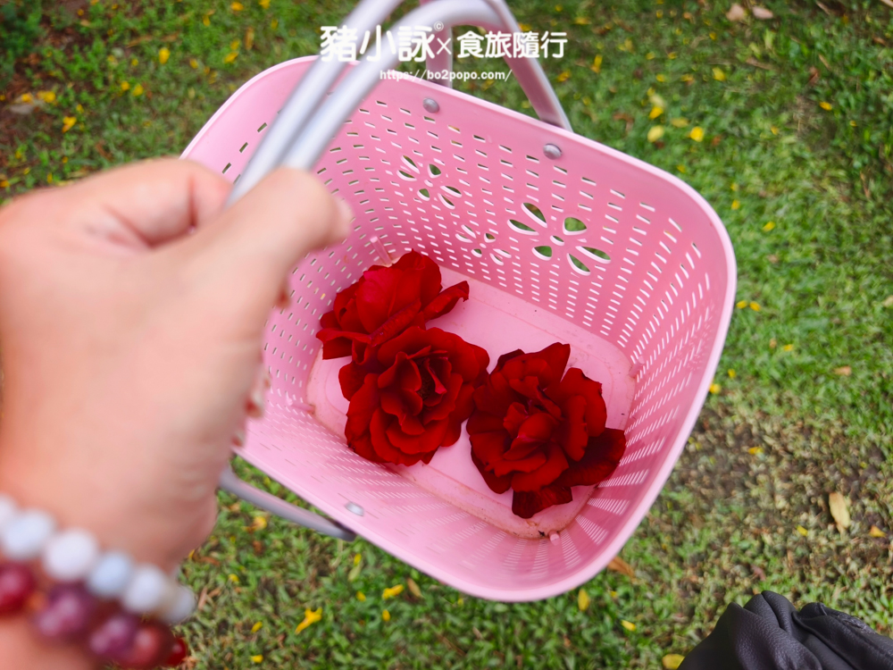 因為當天有在農場消費,依據消費金額,我有免費帶走3朵玫瑰的額度。可以攜帶小竹籃,親身體驗採摘玫瑰花的樂趣。店員會提供簡單的教學,採摘八分開左右的玫瑰花。帶回家的玫瑰花,我是拿來跑熱水飲用,有著濃郁的玫瑰香氣。