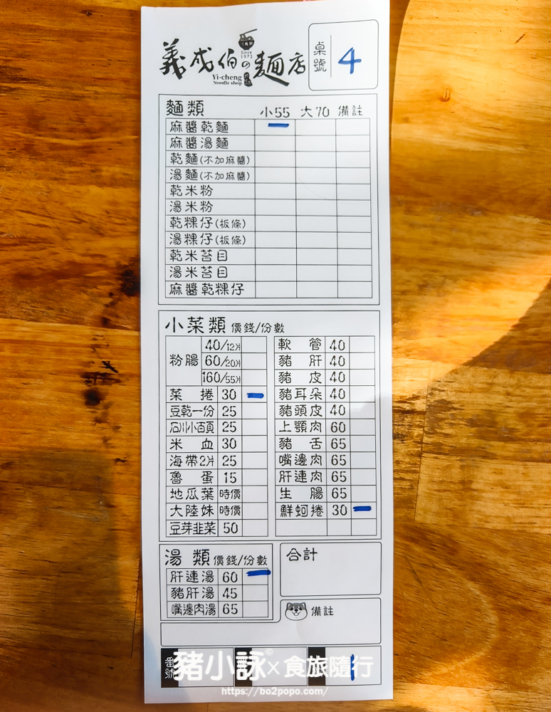 義成伯の麵店的菜單上有多款經典的台灣麵食,以這樣的餐廳氛圍來說,價格算是相當親民,麻醬乾麵約NT$60,菜捲NT$30,肝連湯則為NT$50。味道也還不錯。