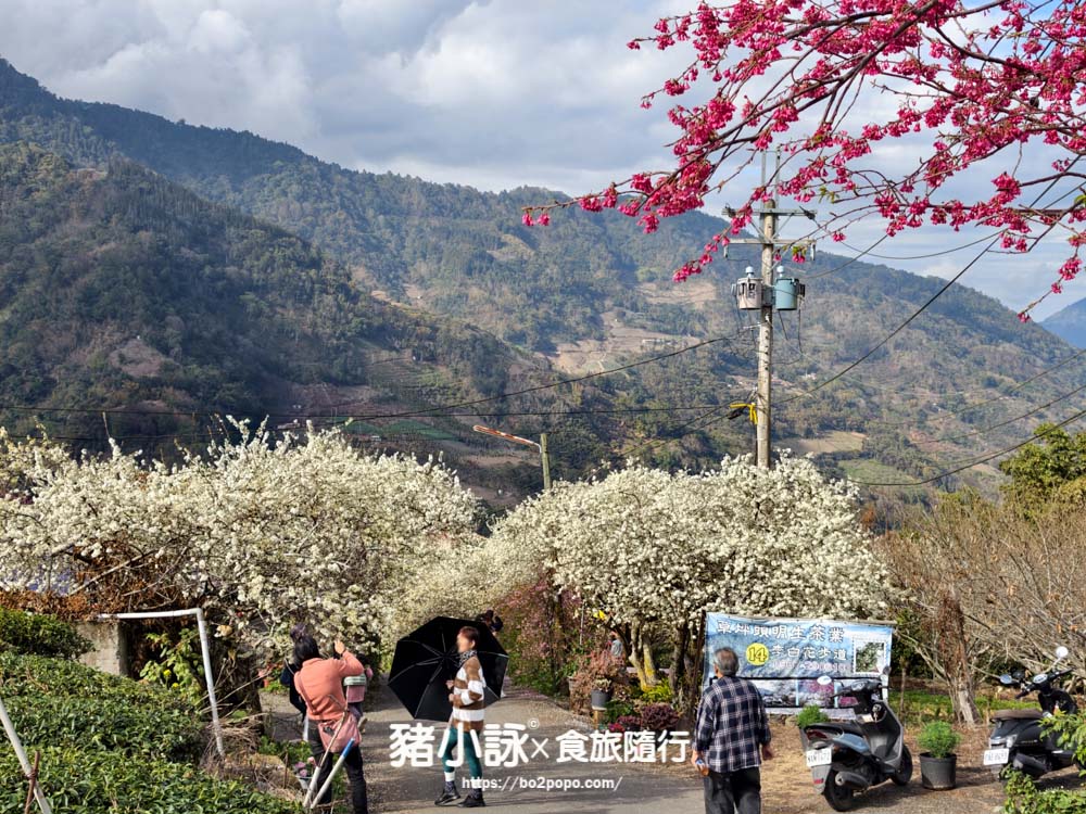這是每次來草坪頭,最經典的造訪處。李花不像櫻花那樣孤傲,它們喜歡簇擁而生。明生茶園附近的李花隧道,整棵李樹滿開時,花朵細碎而潔白,如同被暴雪覆蓋的枯枝。當陽光穿過白色花瓣,背景的翠綠茶園會被虛化成溫潤的抹茶色。這裡除了李花,還有粉紅色的垂櫻。