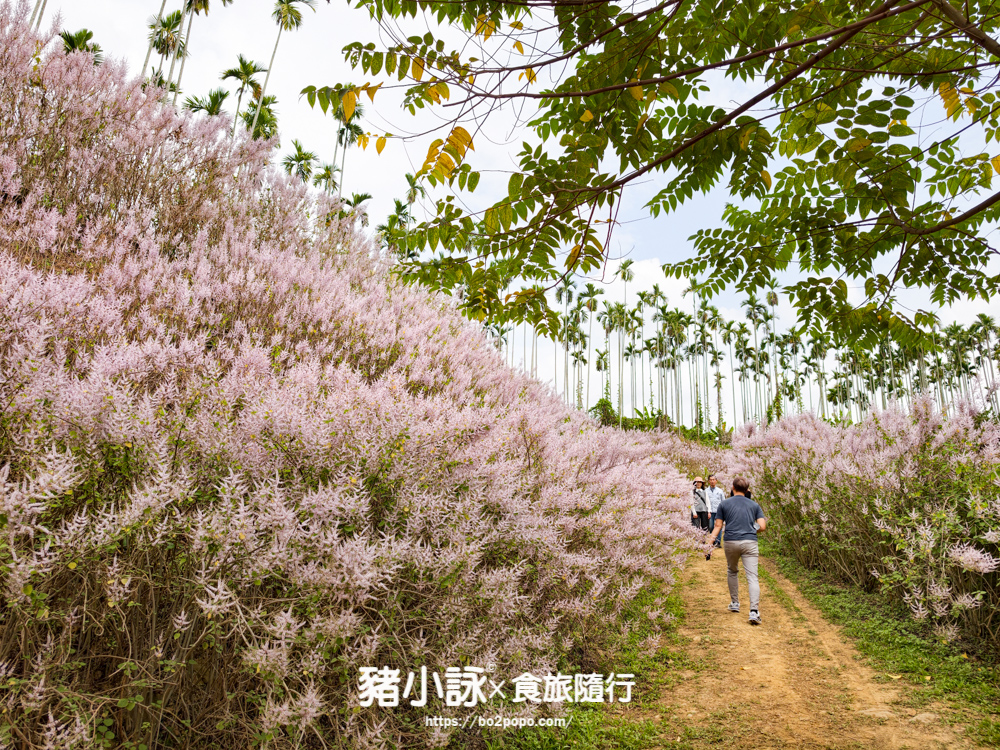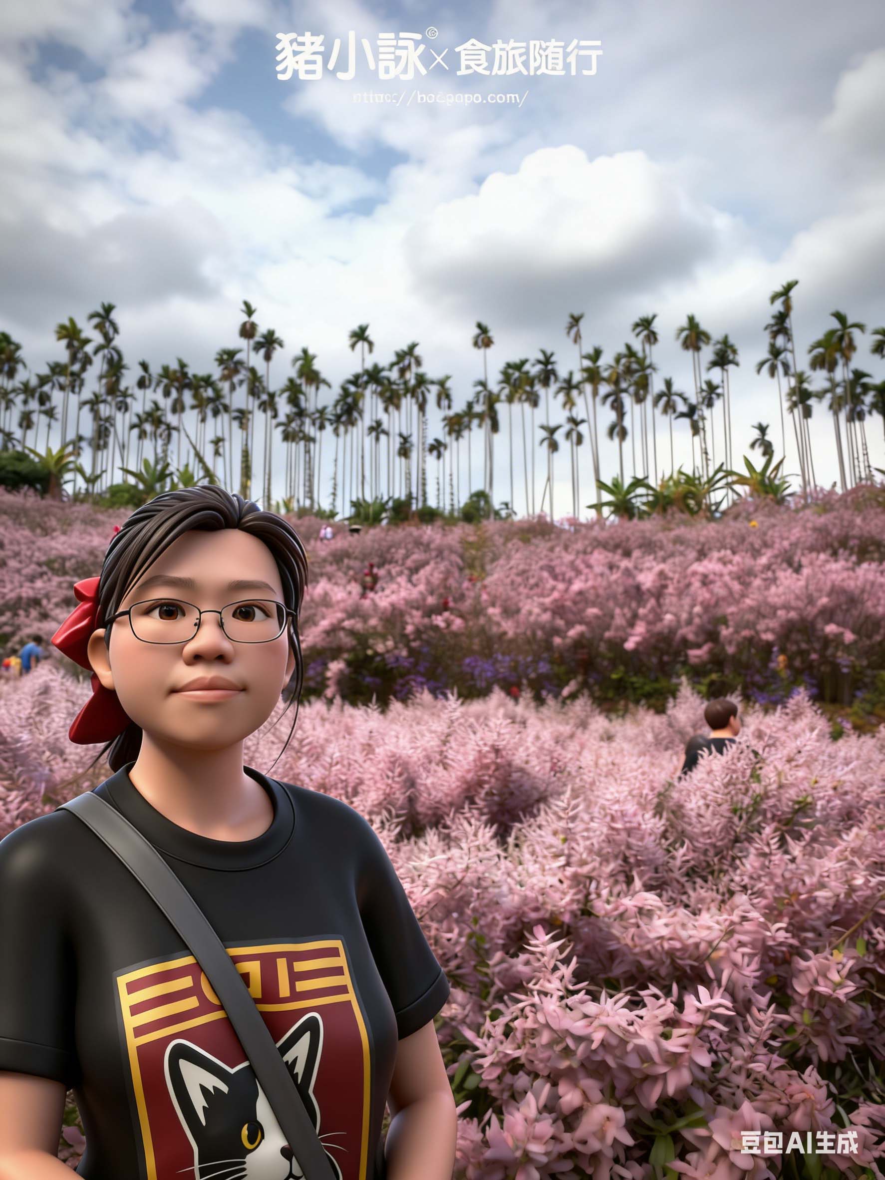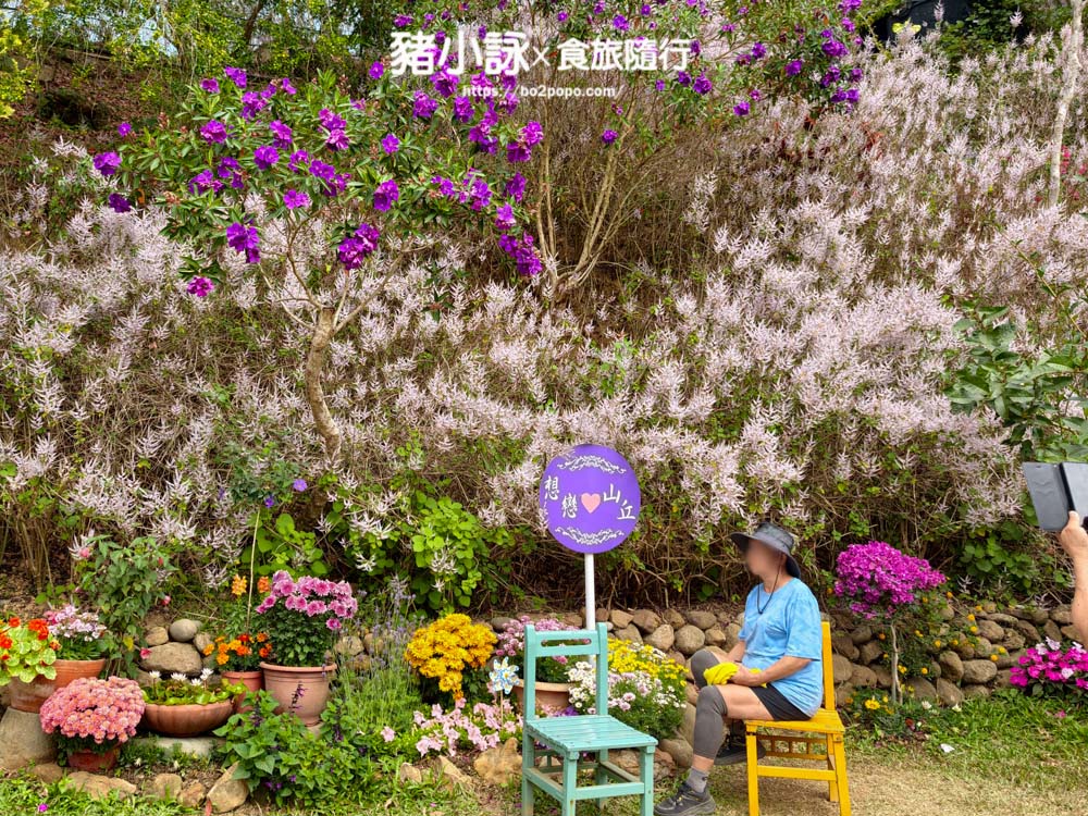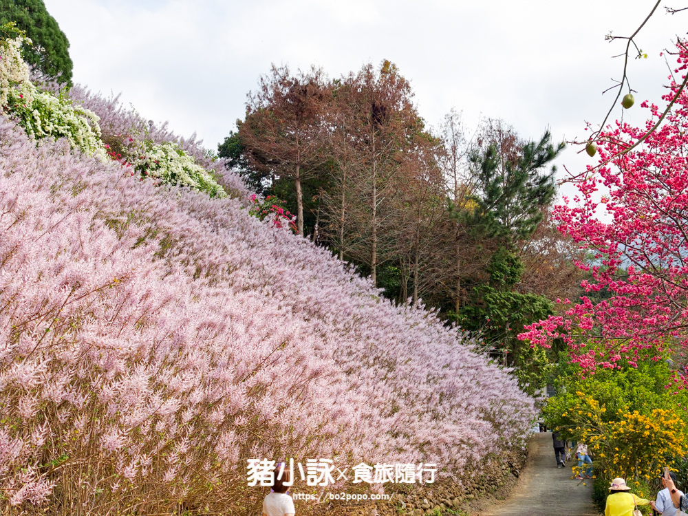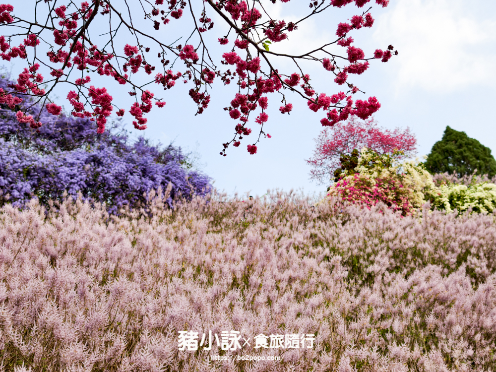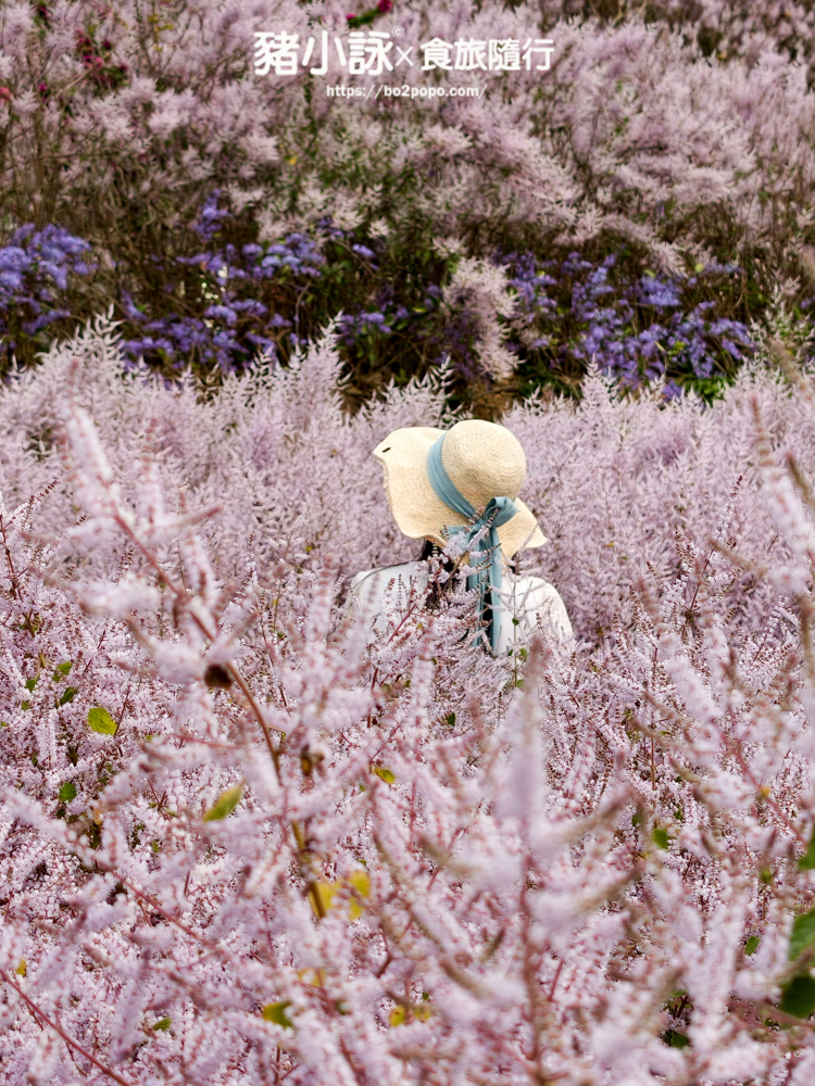南座落於南投中寮的瑰蜜甜心玫瑰園,以其廣達八千坪的壯闊規模,重新定義了山林美學。它打破了傳統花海的平面感,將數千株麝香木依序植入,利用陡峭山坡構築出一座垂直的粉紅迷宮。當你置身其中,麝香木那如霧氣般蓬鬆的粉紫花穗不再只是背景,而是從腳下延伸至頭頂,彷彿大自然為這座山頭披上了一層柔軟的草本毛毯。這不僅是一處花園,更是一件垂直向度的粉色地景藝術