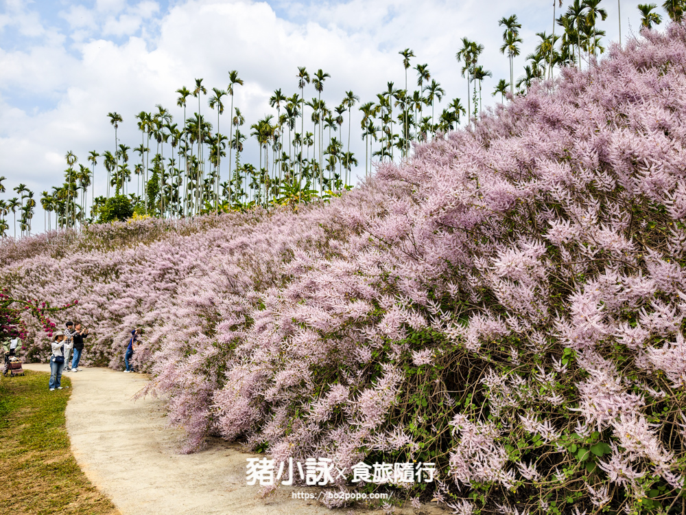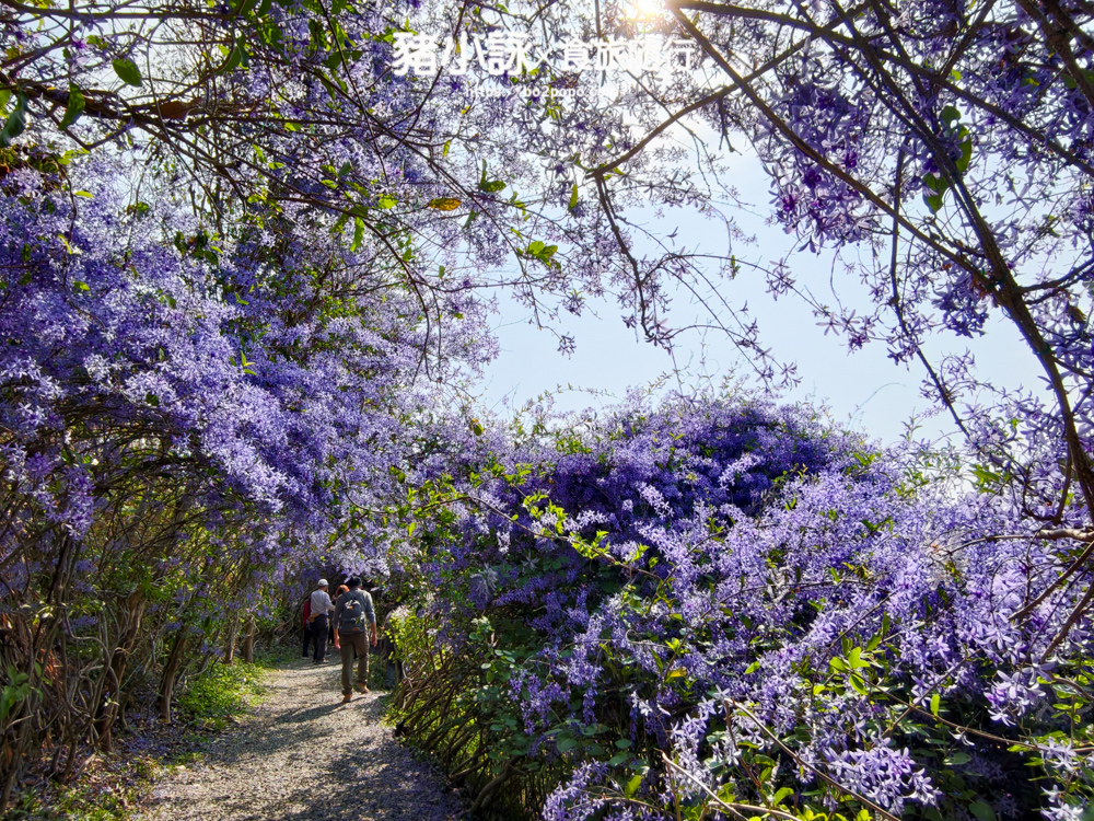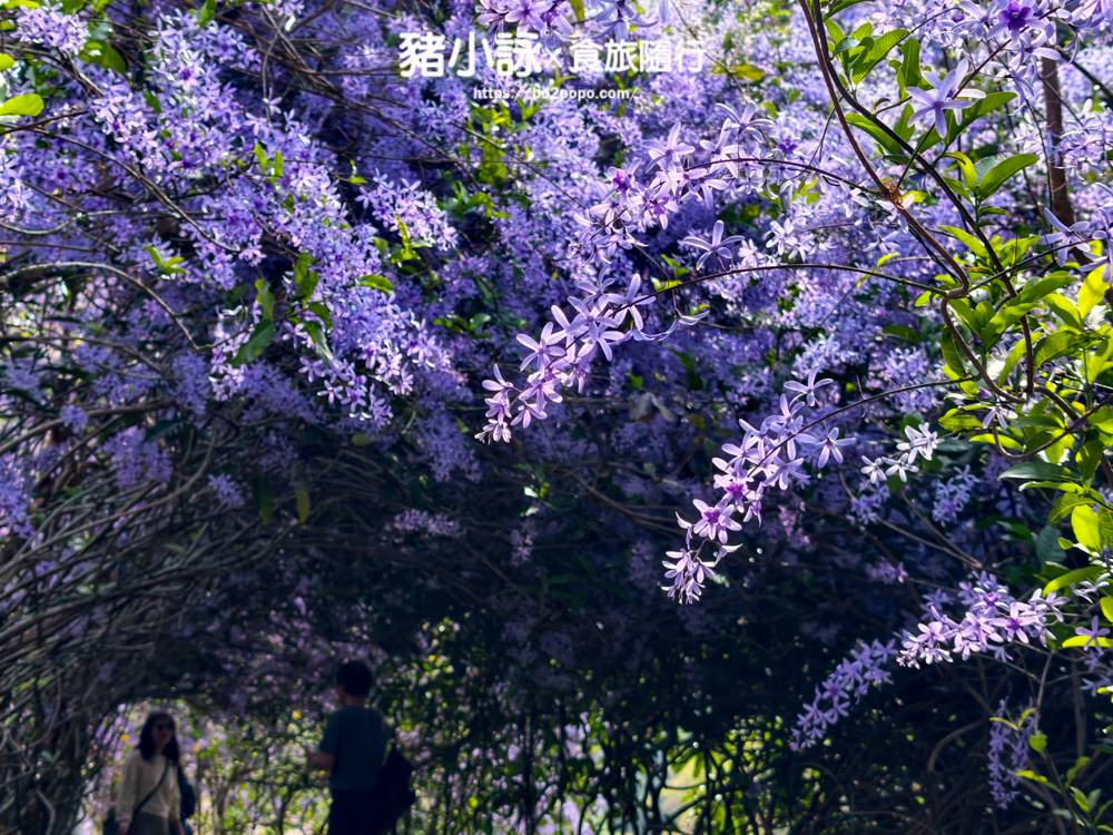 園區入口處就有錫葉藤步道,紫色的花朵如瀑布般傾瀉而下。錫葉藤的花色更深,與粉紫色的麝香木形成強烈的色彩對比。