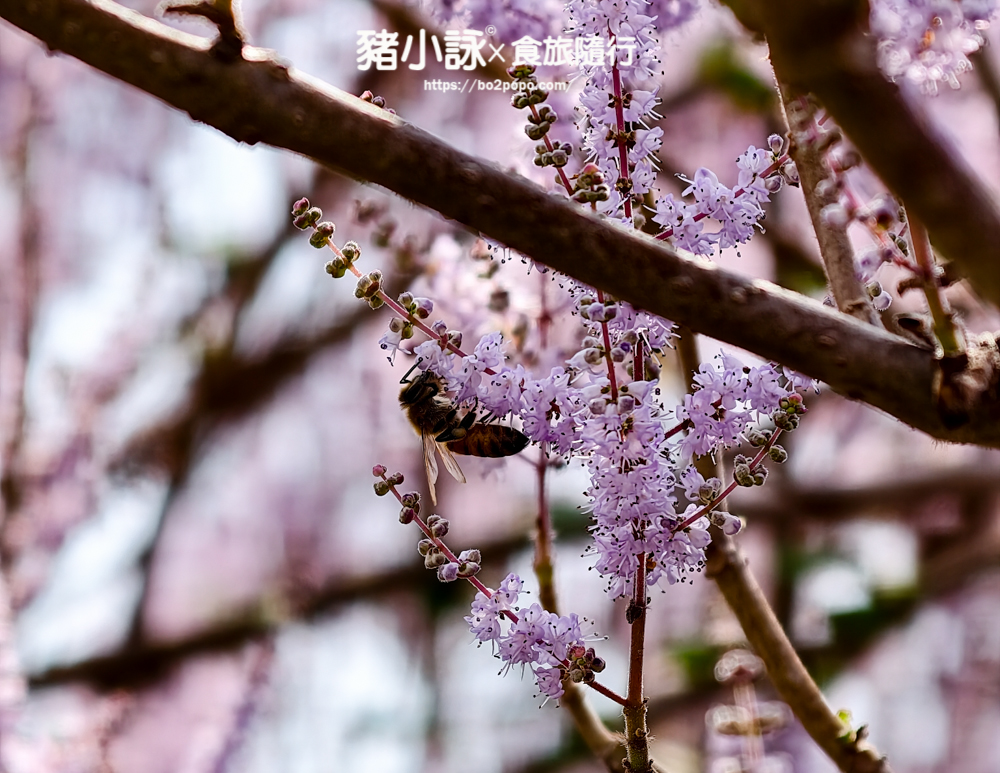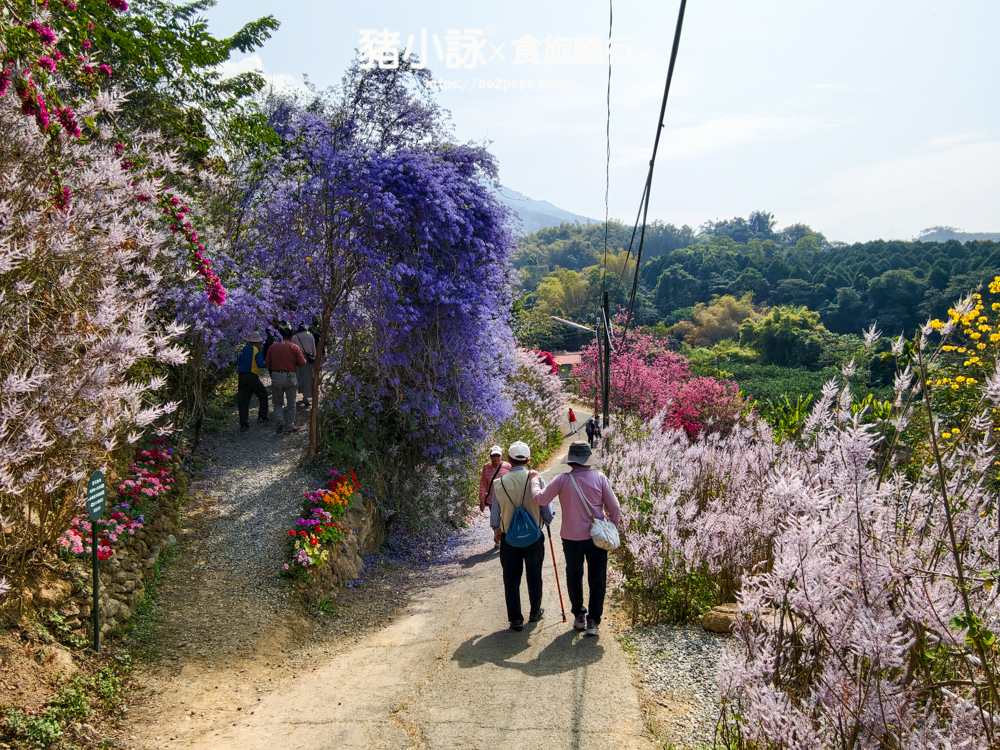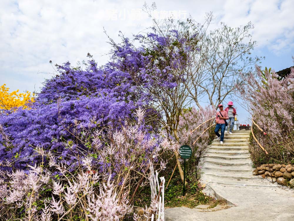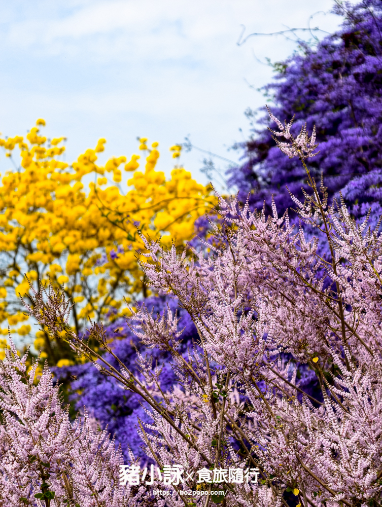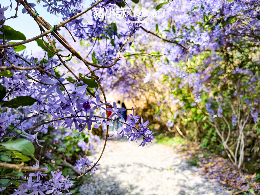當天入園,我的快門幾乎沒有停過。這裡最令人驚豔的,莫過於麝香木、錫葉藤與九重葛三種不同色階的紫色與粉色交織在一起。