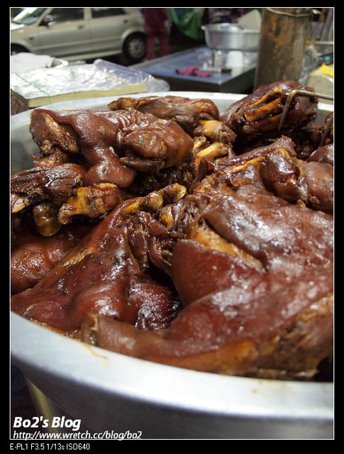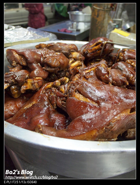 門口算是外帶區,餐檯上的鐵製大臉盆,裡頭滿滿都是色澤看起來油亮油亮的滷豬腳,數大果然就是種美。
