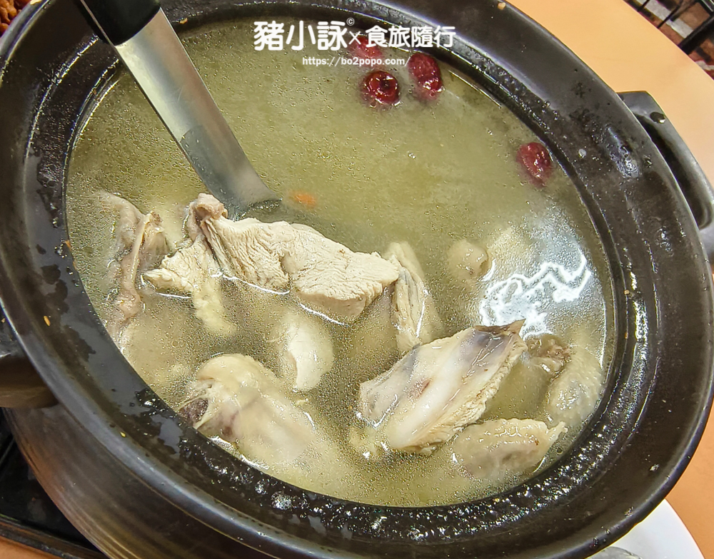 枸尾雞是用狗尾草下去熬煮的雞湯。這道湯品,清澈卻不失深度,湯頭帶著淡淡的草香,卻沒有一般藥膳湯的苦澀,反而是一種回甘的清甜。雞肉肉質保有土雞特有的彈性。