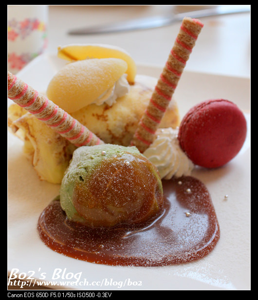 除了捲本身,還有馬卡龍跟抹茶冰淇淋,再加上焦糖沾醬,