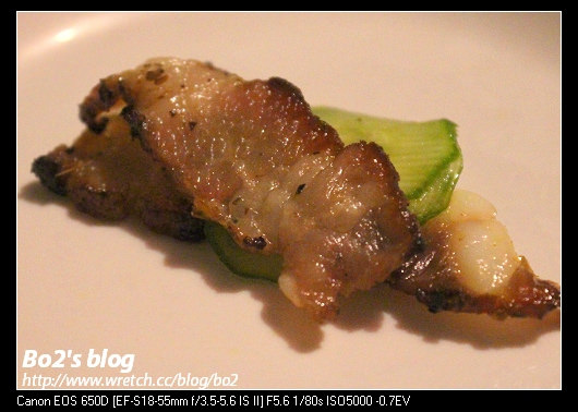 醃漬過的松阪豬切成薄片,夾上黃瓜一起吃,很是清爽。