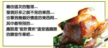 火雞大餐 DIY胡亂動手做 2008-07-23 相關 相關文章台南。東區》狐獴先生-零距離!狐獴陪你用餐的超萌咖啡廳屏東。枋寮》椰們海景餐廳,夕陽、咖啡、蛋糕,感受枋寮海邊的絕美慢活時光嘉義。阿里山》阿將的家23咖啡館、山林中的秘境嘉義。番路》欣欣水泥森活園-以水泥為主題的觀光工廠高雄。美濃》888客家粄條店+美濃白玉蘿蔔股東會半日遊屏東。佳冬》古蹟巡禮:穿越時空,深度探索客家風華!(蕭家古厝、蕭屋洋樓、理學第(豫章堂)、張家商樓、蕭屋聖亭、步月樓、楊及芹祖堂、西隘門、北隘門、楊氏宗祠、摩艾樹)屏東。屏東市》走進南國的耶誕童話:和平教會與夢幻薑餅屋台中。霧峰》林家花園深度導覽-穿越時空,探秘台灣近代史的脈動與建築之美!(林獻堂博物館、萊園、蓉鏡齋、景薰樓)台南。官田》隆田米糕:超人氣的巷弄美味 ::胡混的菸酒生生涯:: 3 Comments 由 小詠 小詠 你也許會喜歡 20091225祝大家聖誕節快樂喔 2009-12-24 logo設計-高苑資訊科技系 2008-11-05 20100515網頁設計-高苑科大榮譽榜網頁版型(純記錄) 2010-05-14 3 留言 回覆 小蜜蜂 2008-07-29 於 20:55:19 2樓的..說的太中肯了…首推..本日最中肯的一句話…==>"等妳痛下決心要整理房間,也大概是個三五年的事了。" 版主回覆:(07/24/2008 05:02:30 PM) 中肯你的頭…最好你的座位跟房間也是很乾淨啦…我就不相信ㄉ說..ㄎㄎㄎ 回覆 jjasmine99tw 2008-07-24 於 19:00:47 = =~~等妳痛下決心要整理房間,也大概是個三五年的事了。ㄎㄎㄎ~~~~~~~~~~~~~~~ 回覆 gnod100 2008-07-24 於 05:50:41 好….特別的一堂課阿 版主回覆:(07/22/2008 01:02:44 PM) 通識課程ㄇㄟ…都是在喇賽用的..^^ 發表留言 取消回應顯示名稱 * 電子郵件地址 * 個人網站網址 在瀏覽器中儲存顯示名稱、電子郵件地址及個人網站網址,以供下次發佈留言時使用。 用電子郵件通知我後續的迴響。 新文章使用電子郵件通知我。 Δ