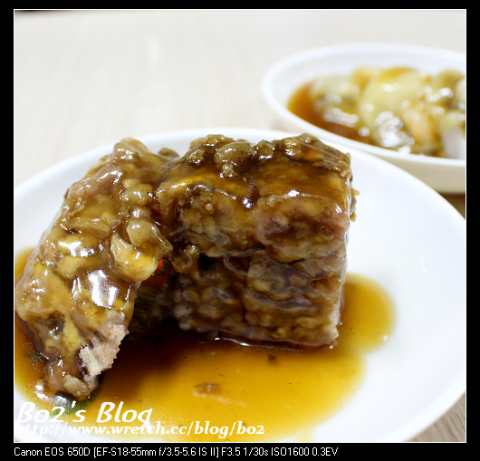 是一小顆一小顆蒸的牙齒肉圓,一樣是淋上醬油膏。