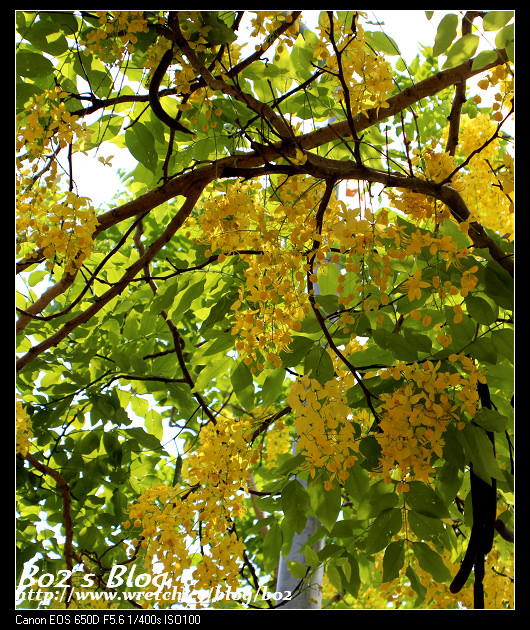 夾道兩旁都是阿勃勒,花開燦爛金黃耀眼的模樣,
