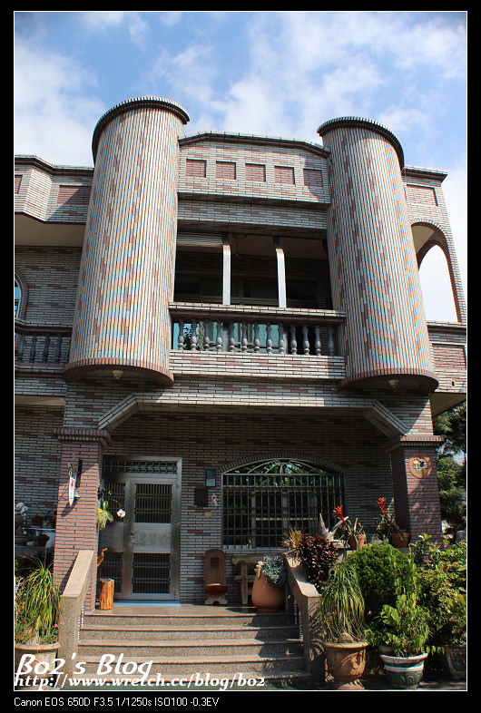 主屋正面造型有點像中古歐洲城堡,側面很民居,貼滿磁磚有著很濃的台灣味。