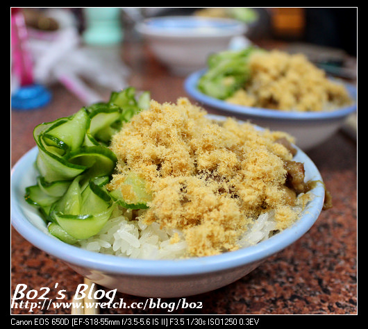 粒粒分明的米粒上淋了肉燥後,滿覆肉鬆跟小黃瓜,
