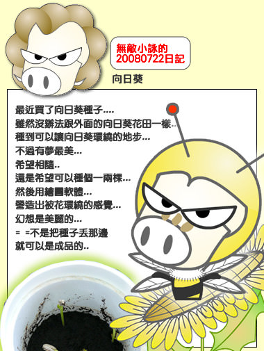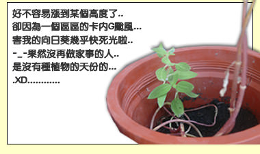 向日葵 DIY胡亂動手做 2008-07-21 相關 相關文章屏東。屏東市》走進南國的耶誕童話:和平教會與夢幻薑餅屋嘉義。阿里山》阿將的家23咖啡館、山林中的秘境台中。霧峰》林家花園深度導覽-穿越時空,探秘台灣近代史的脈動與建築之美!(林獻堂博物館、萊園、蓉鏡齋、景薰樓)嘉義。番路》欣欣水泥森活園-以水泥為主題的觀光工廠屏東。佳冬》古蹟巡禮:穿越時空,深度探索客家風華!(蕭家古厝、蕭屋洋樓、理學第(豫章堂)、張家商樓、蕭屋聖亭、步月樓、楊及芹祖堂、西隘門、北隘門、楊氏宗祠、摩艾樹)高雄。美濃》888客家粄條店+美濃白玉蘿蔔股東會半日遊台南。東區》狐獴先生-零距離!狐獴陪你用餐的超萌咖啡廳台南。官田》隆田米糕:超人氣的巷弄美味屏東。枋寮》椰們海景餐廳,夕陽、咖啡、蛋糕,感受枋寮海邊的絕美慢活時光 樂--[植物] 2 Comments 由 小詠 小詠 你也許會喜歡 20100604圖像日記-手繪明信片 2010-06-03 2013豬頭生活記事-祝建富同學生日快樂(準備篇) 2013-01-10 2010高雄食記-旗津古早味蕃茄切盤 2010-01-10 2 留言 回覆 jjasmine99tw 2008-07-22 於 03:19:13 = =+新造型真的是讓我狂冒汗.. 版主回覆:(07/22/2008 07:43:04 AM) 妳對我的新造型很有意見喔..XD 回覆 gogod 2008-07-21 於 23:25:49 對丫..有沒有做家事從很多地方都可以看得出來的…哇哈哈哈… 版主回覆:(07/22/2008 07:45:45 AM) 從打人的力道嗎…這個我不能同意在多了…翻桌………. 發表留言 取消回應顯示名稱 * 電子郵件地址 * 個人網站網址 在瀏覽器中儲存顯示名稱、電子郵件地址及個人網站網址,以供下次發佈留言時使用。 用電子郵件通知我後續的迴響。 新文章使用電子郵件通知我。 Δ