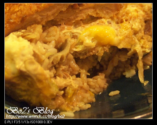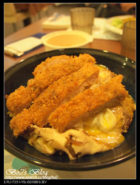 飯上頭覆蓋了炸過的豬排,還淋上蛋液,看起來就是很好吃,
