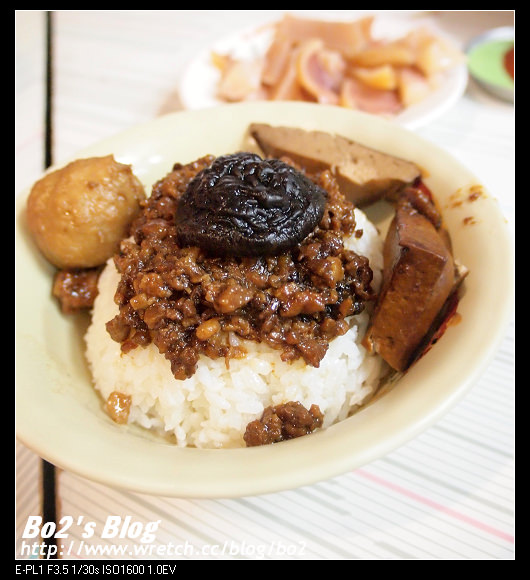 一碗白飯上蓋了肉燥+香菇一朵+豆干+丸子,沒錯,這麼乾單的一碗飯,要價NT.50,這一定要來吃看看有何過人之處她們家的配料都有個重點,就是滷到十分的夠味,就像滷蛋可以滷成鐵蛋那樣的程度,香菇/豆干/丸子比照辦理,