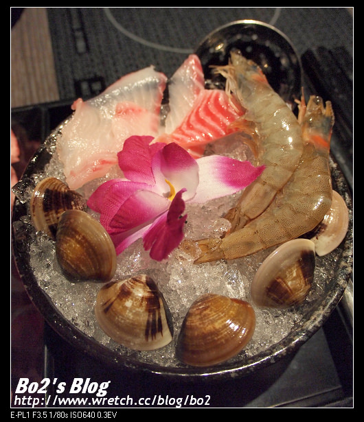 海陸雙品,海的部分,有蛤蠣,蝦子跟鯛魚片,蝦子頭尖刺的部份可是有剪掉,很貼心,