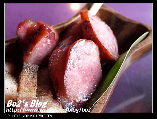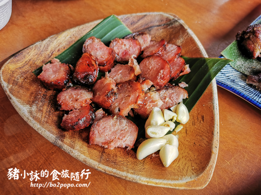 大香腸也是用碳烤方式料理,肥瘦恰到好吃,一旁還有附蒜頭。