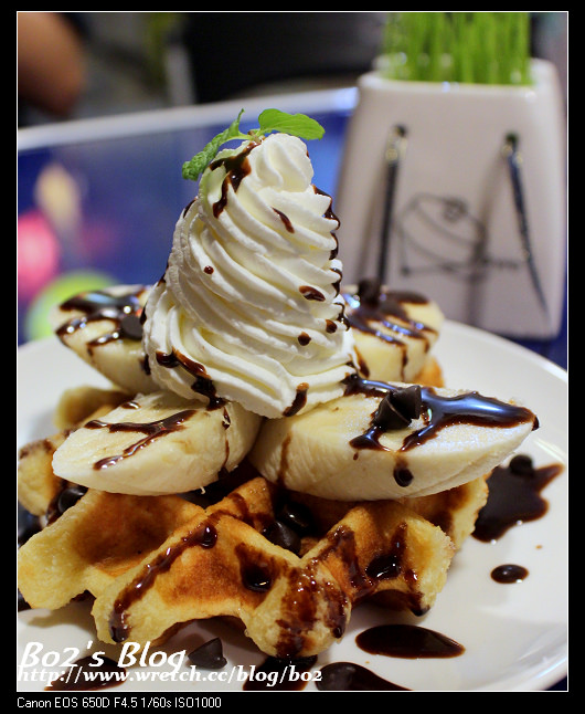搭上鬆餅,淋上巧克力醬,這樣吃也是很不錯,跟加了冰淇淋的感覺又不大一樣哩。