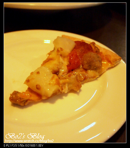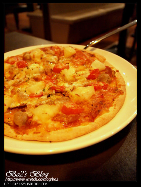 嘉百利的披薩是薄皮的,餅皮吃起來又脆又香,裡頭的配料還算豐富,有雞肉/鳳梨/蕃茄等等,雖然起司沒有特多,
