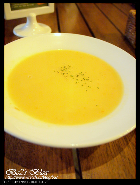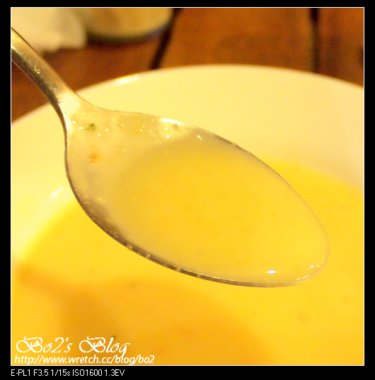 這濃湯應該是將玉米打碎後下去煮的玉米濃湯,甜甜的口味很順口。