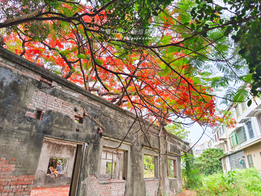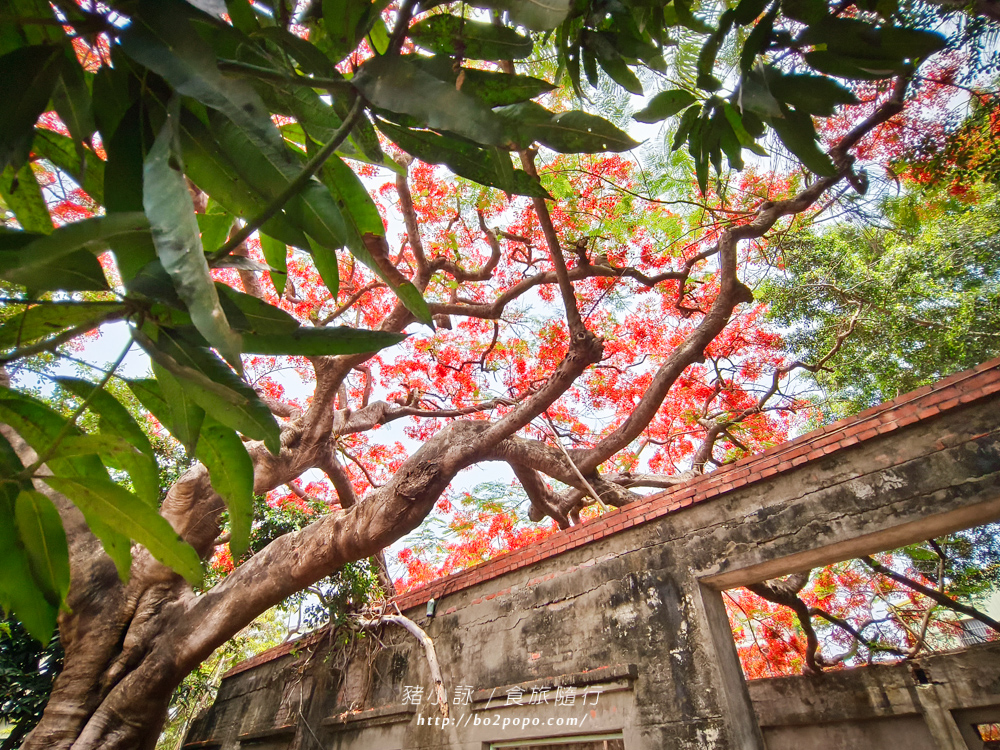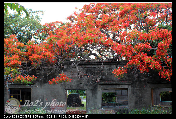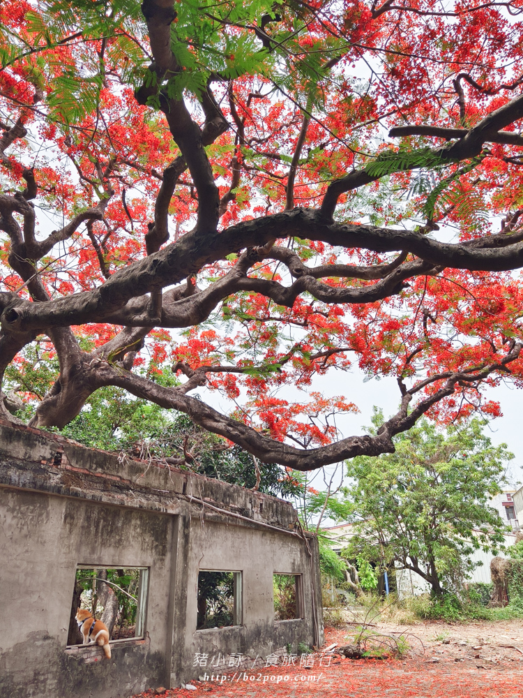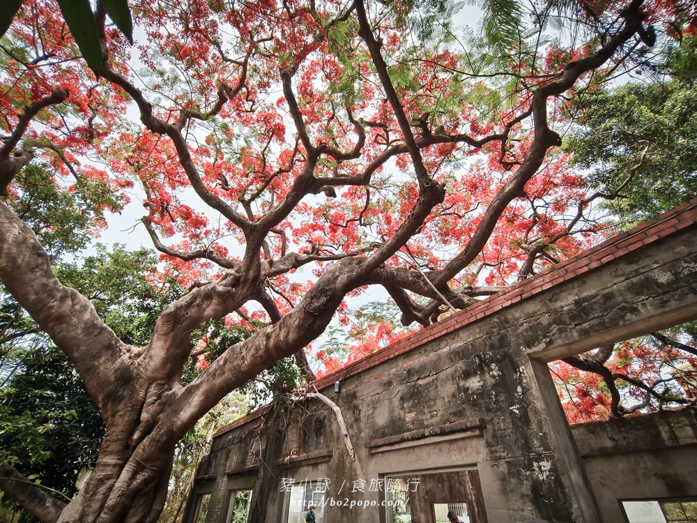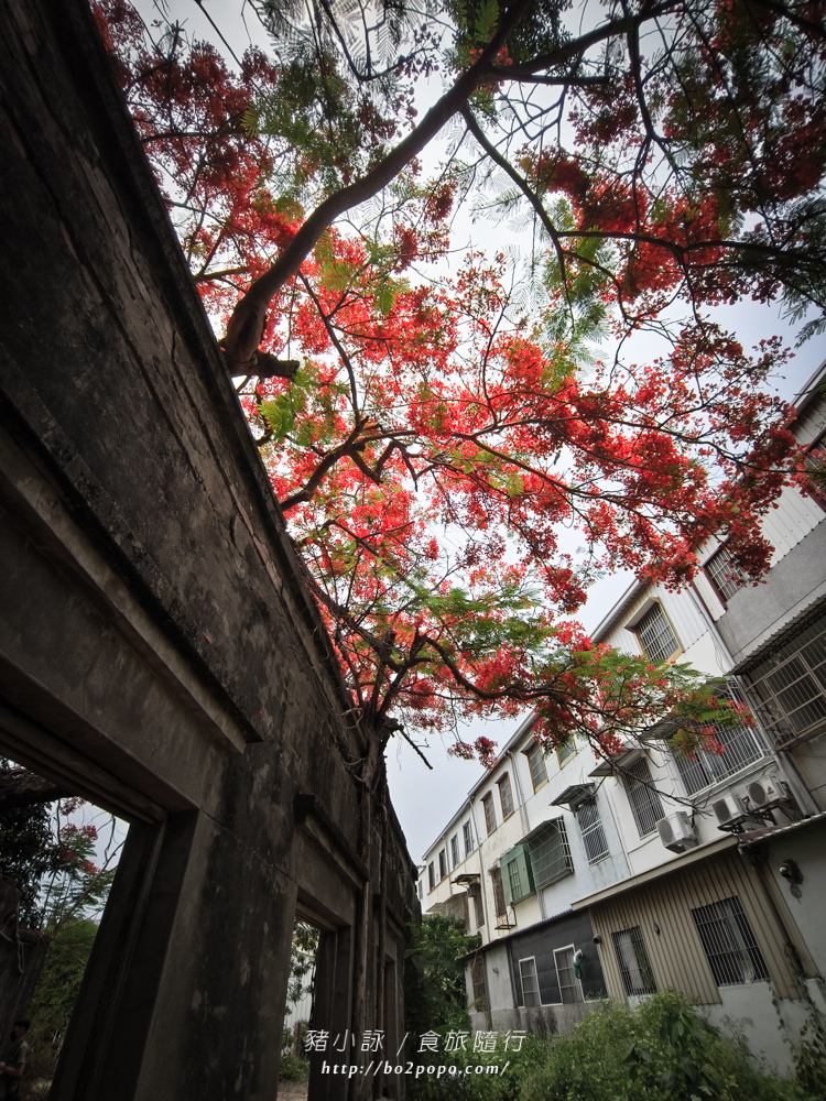 殘破的廢虛內,矗立了一顆大滿開的鳳凰花樹,是個很奇特的景像。