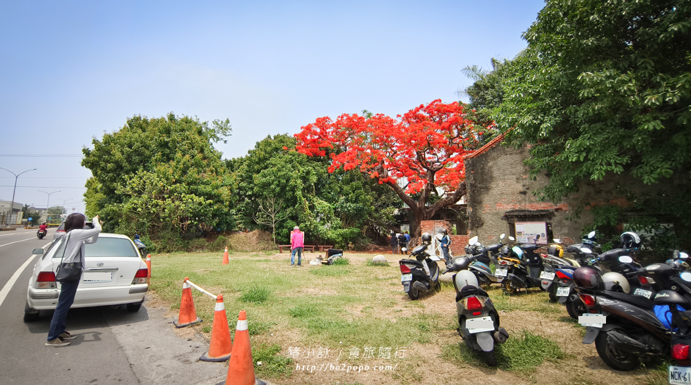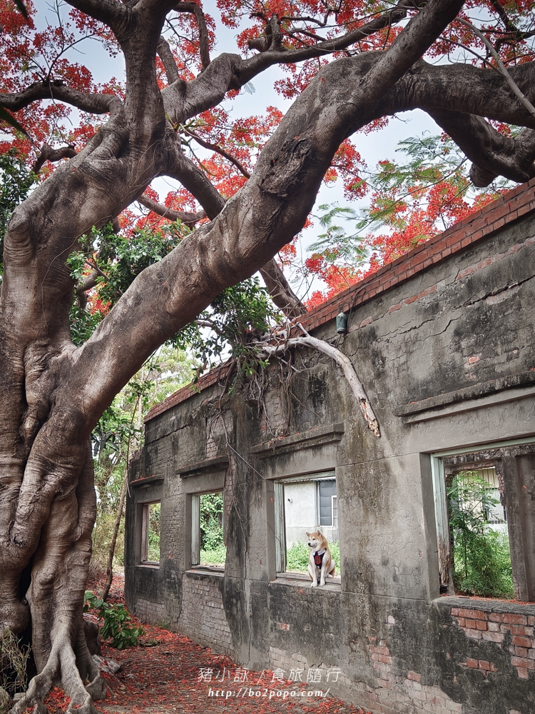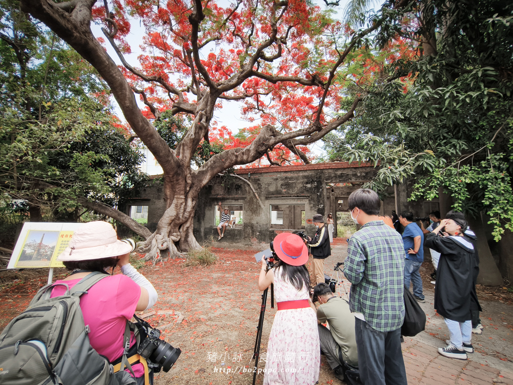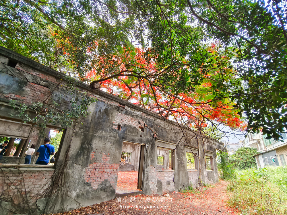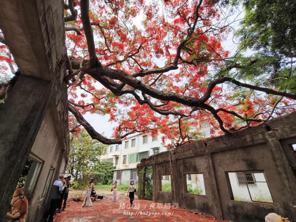 殘破的廢虛內,矗立了一顆大滿開的鳳凰花樹,是個很奇特的景像。