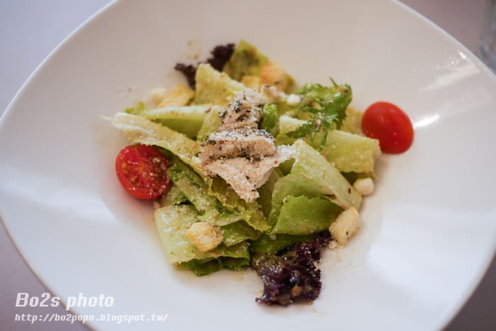 沙拉部份,有凱薩及橙醋沙拉兩款,凱薩醬汁混合其中,